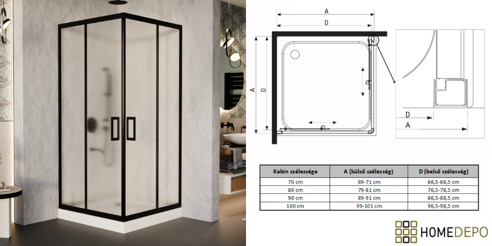 Napjainkban a praktikum mellett a fürdőszoba esztétikus megjelenése is fontos szempont. Az átlátszó üveges zuhanykabinok egyik előnye, hogy nem szűkitik össze a teret, elegáns, légies megjelenést kölcsönöznek a fürdőszobának. Az átlátszó üvegű zuhanykabinok a hagyományos és modern fürdőszobákban is megállják a helyüket. Az tolóajtónál az ajtónyílásból elvesznek az egymásra csúszó részek. Kisebb helyiségekben is kiváló megoldás lehet helytakarékosság szempontjából, mivel így nem kell arra figyeljen, hogy legyen elég hely az ajtó kinyitásához. A szögletes formával a rendelkezésre álló teret maximálisan ki lehet használni. Előnye, hogy zuhanyzáskor kényelmes, az íves formánál jelentősen nagyobb tér áll rendelkezésre. Saját márkás, Homedepo Moment, szögletes zuhanykabinunk, dupla görgőkkel érhető el, aminek köszönhetően jobban eloszlik a terhelés, egy ajtó 2 pont helyett 4 ponton gördül. Ez nagy mértékben biztosítja az egyenletesebb, simább működést és a hosszabb élettartamot. A görgők további fontos tulajdonságai közé sorolható, hogy Quick release systemmel ellátottak, aminek segítségével könnyedén fel- és leszerelhető a könnyedebb tisztítás érdekében.