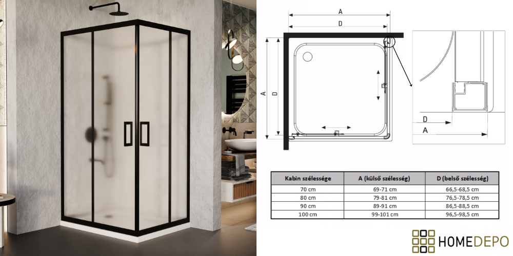 Napjainkban a praktikum mellett a fürdőszoba esztétikus megjelenése is fontos szempont. Az átlátszó üveges zuhanykabinok egyik előnye, hogy nem szűkitik össze a teret, elegáns, légies megjelenést kölcsönöznek a fürdőszobának. Az átlátszó üvegű zuhanykabinok a hagyományos és modern fürdőszobákban is megállják a helyüket. Az tolóajtónál az ajtónyílásból elvesznek az egymásra csúszó részek. Kisebb helyiségekben is kiváló megoldás lehet helytakarékosság szempontjából, mivel így nem kell arra figyeljen, hogy legyen elég hely az ajtó kinyitásához. A szögletes formával a rendelkezésre álló teret maximálisan ki lehet használni. Előnye, hogy zuhanyzáskor kényelmes, az íves formánál jelentősen nagyobb tér áll rendelkezésre. Saját márkás, Homedepo Moment, szögletes zuhanykabinunk, dupla görgőkkel érhető el, aminek köszönhetően jobban eloszlik a terhelés, egy ajtó 2 pont helyett 4 ponton gördül. Ez nagy mértékben biztosítja az egyenletesebb, simább működést és a hosszabb élettartamot. A görgők további fontos tulajdonságai közé sorolható, hogy Quick release systemmel ellátottak, aminek segítségével könnyedén fel- és leszerelhető a könnyedebb tisztítás érdekében.