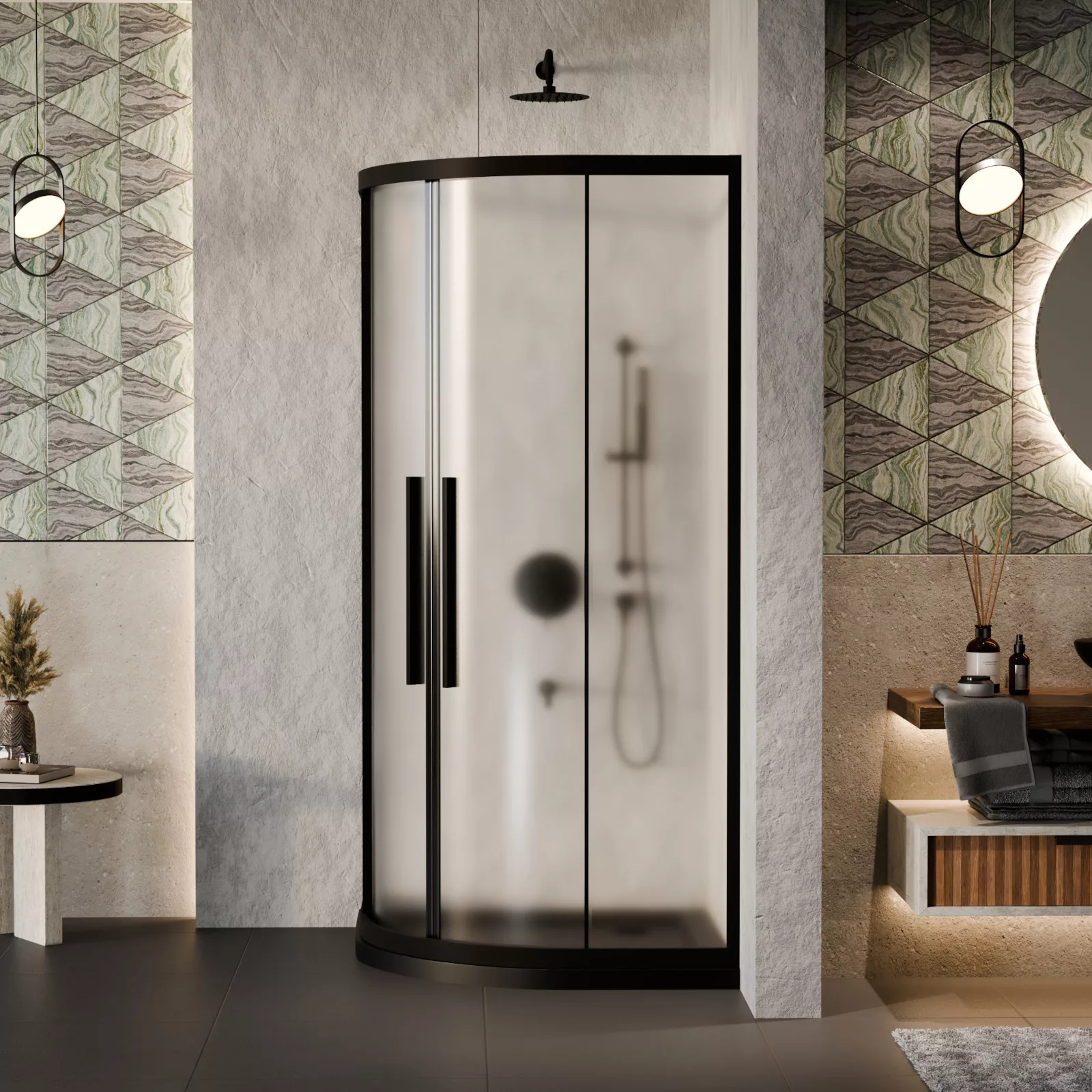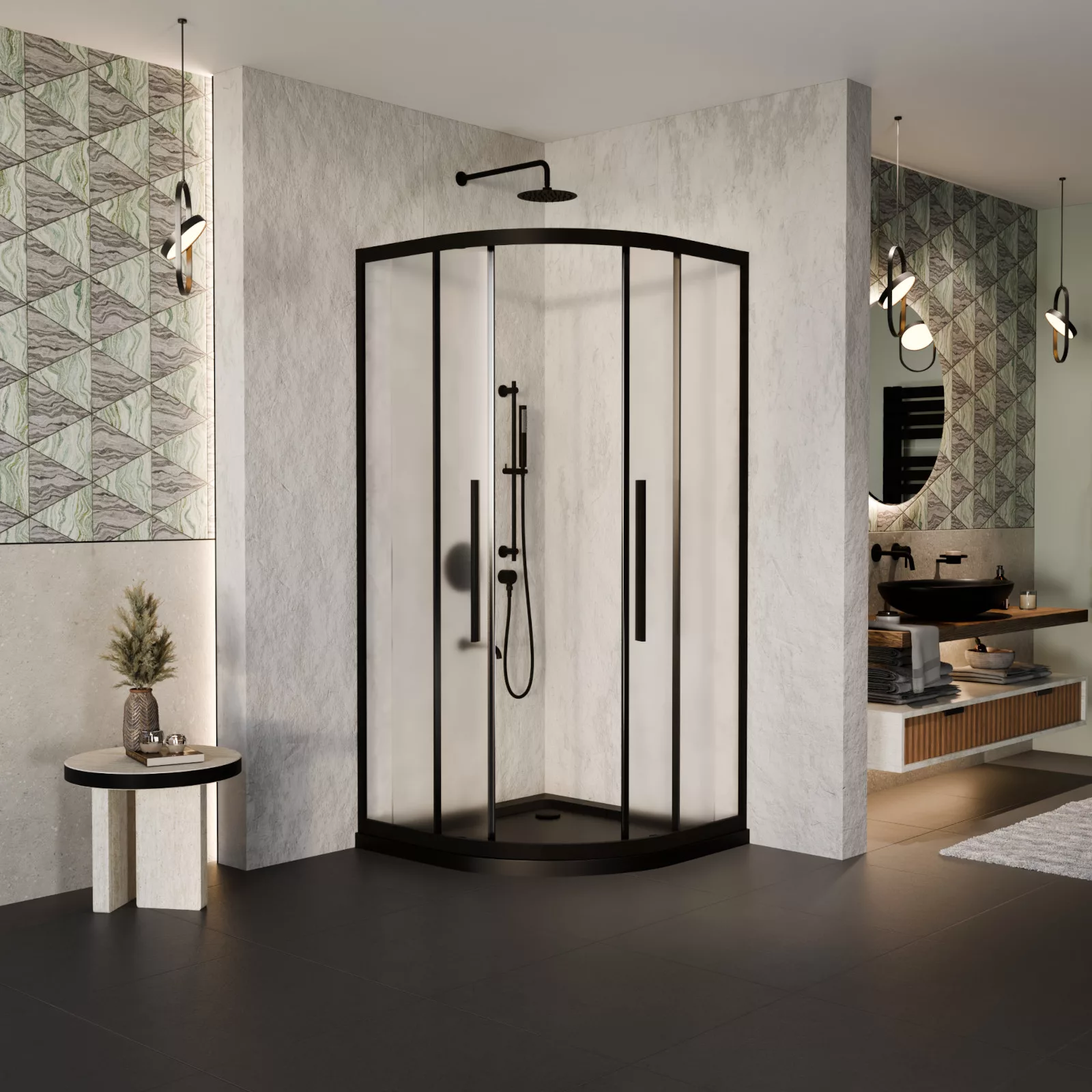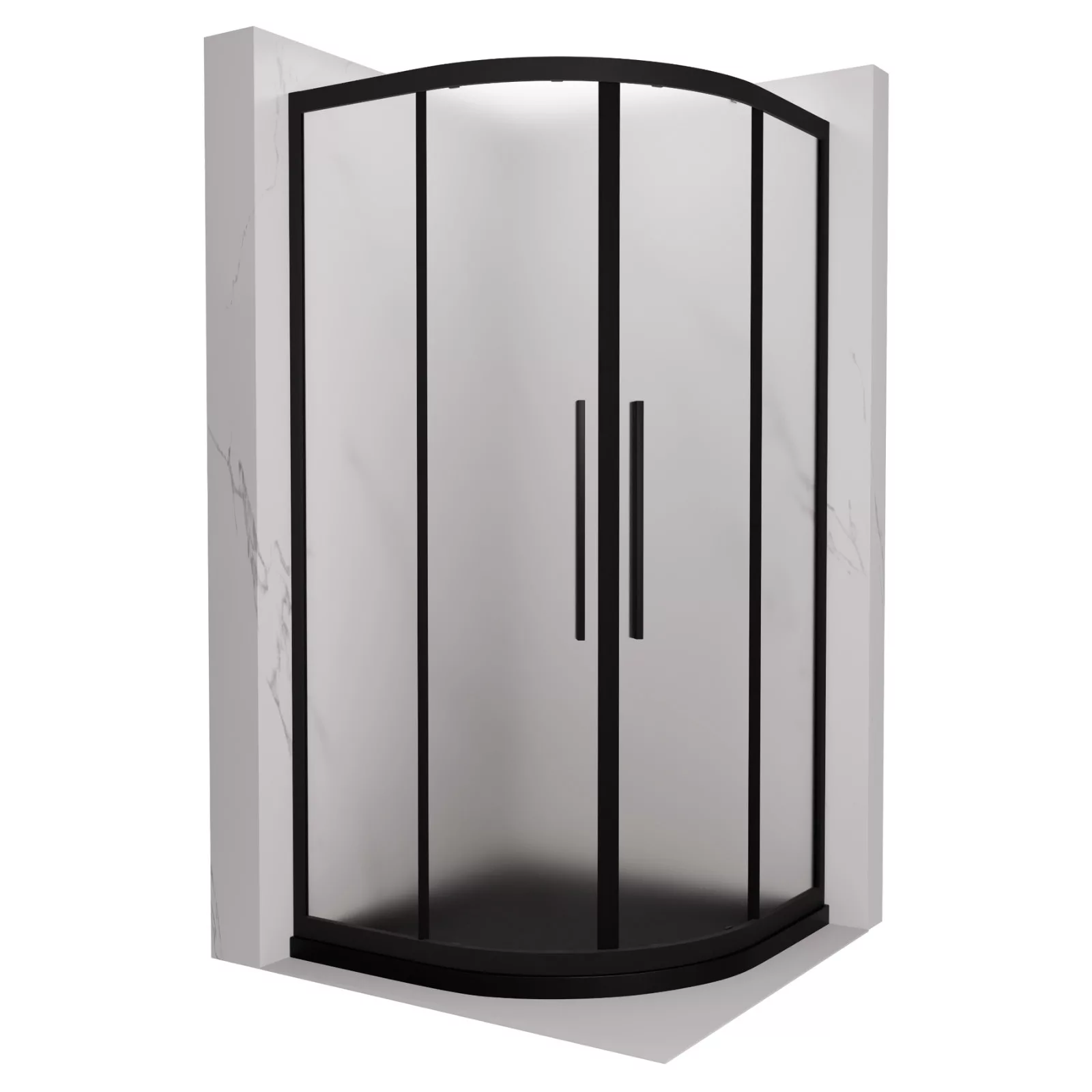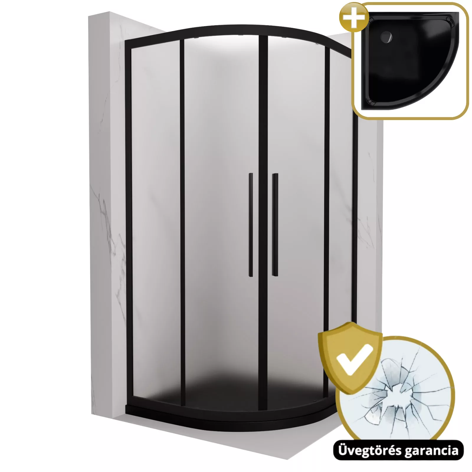 HD Moment+ 90x90 íves két tolóajtós zuhanykabin fekete slim zuhanytálcával és króm szifonnal