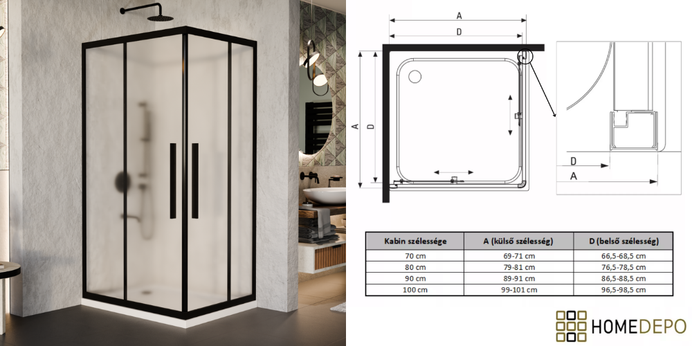 Napjainkban a praktikum mellett a fürdőszoba esztétikus megjelenése is fontos szempont. Az átlátszó üveges zuhanykabinok egyik előnye, hogy nem szűkitik össze a teret, elegáns, légies megjelenést kölcsönöznek a fürdőszobának. Az átlátszó üvegű zuhanykabinok a hagyományos és modern fürdőszobákban is megállják a helyüket. Az tolóajtónál az ajtónyílásból elvesznek az egymásra csúszó részek. Kisebb helyiségekben is kiváló megoldás lehet helytakarékosság szempontjából, mivel így nem kell arra figyeljen, hogy legyen elég hely az ajtó kinyitásához. A szögletes formával a rendelkezésre álló teret maximálisan ki lehet használni. Előnye, hogy zuhanyzáskor kényelmes, az íves formánál jelentősen nagyobb tér áll rendelkezésre. Saját márkás, Homedepo Elio, szögletes zuhanykabinunk, dupla görgőkkel érhető el, aminek köszönhetően jobban eloszlik a terhelés, egy ajtó 2 pont helyett 4 ponton gördül. Ez nagy mértékben biztosítja az egyenletesebb, simább működést és a hosszabb élettartamot. A görgők további fontos tulajdonságai közé sorolható, hogy Quick release systemmel ellátottak, aminek segítségével könnyedén fel- és leszerelhető a könnyedebb tisztítás érdekében.