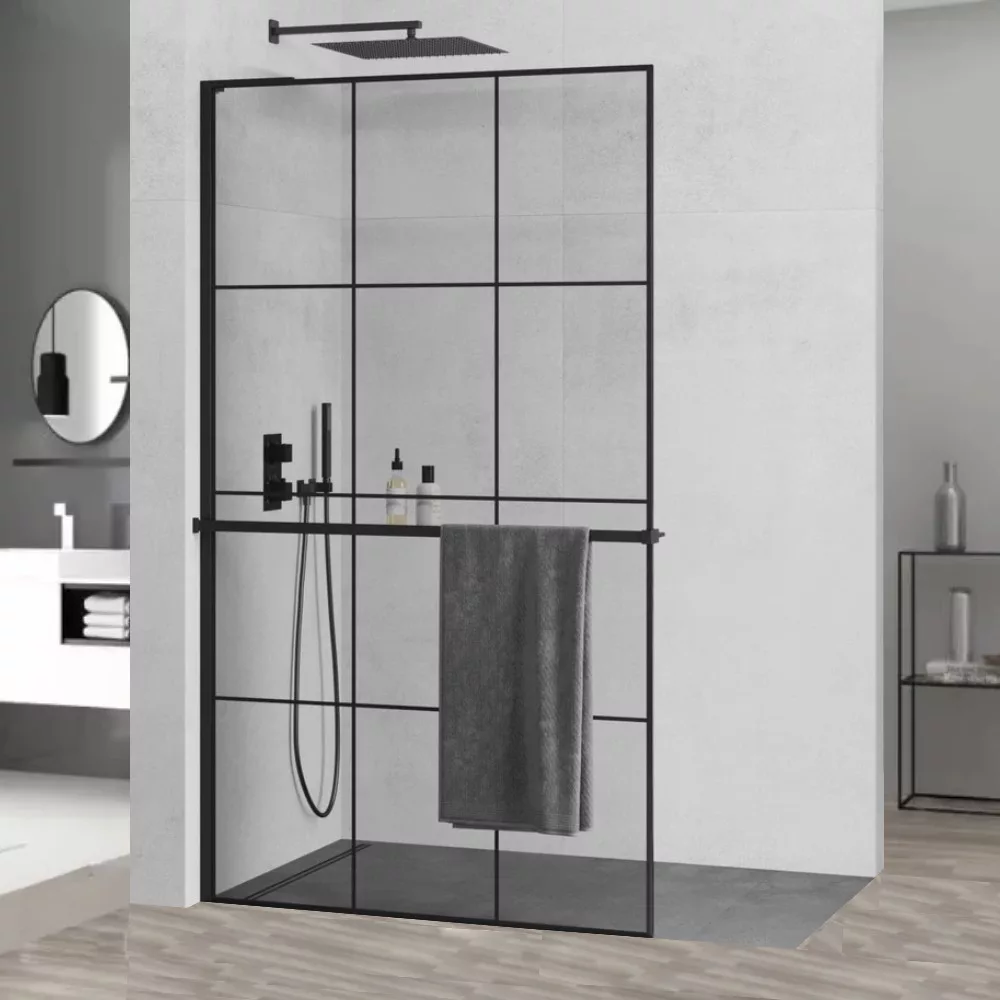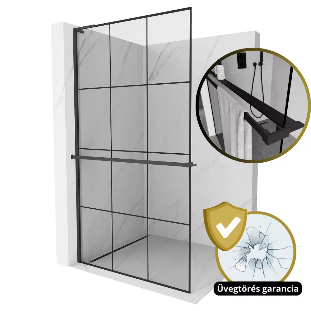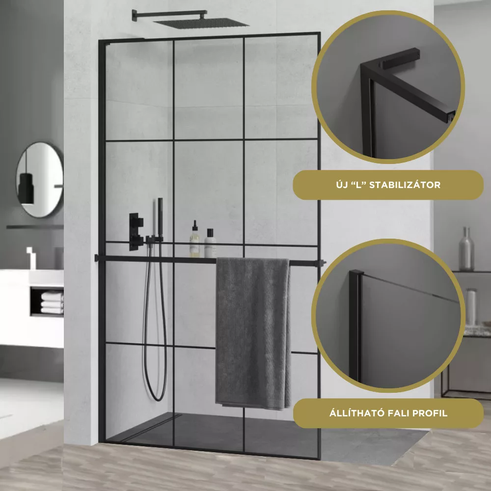 A mai modern stílusnak megfelelően alkottuk meg a visszafogott, mégis szemet gyönyörködtető Walk-In zuhanyfalunkat. Helyet kaphat bármilyen stílusú fürdőszobában, képes a belső összképhez hozzájárulni. A fekete színű profilok, a "L" stabilizátor és a tusfürdő tartó polc remek színárnyalatban készülnek el, ami a különböző megvilágítások alatt is kellemes érzetet keltenek. A polc egyaránt alkalmas a tusfürdő tárolására és a törölköző tárolására, így biztosítva még nagyobb kényelmet a használat során!