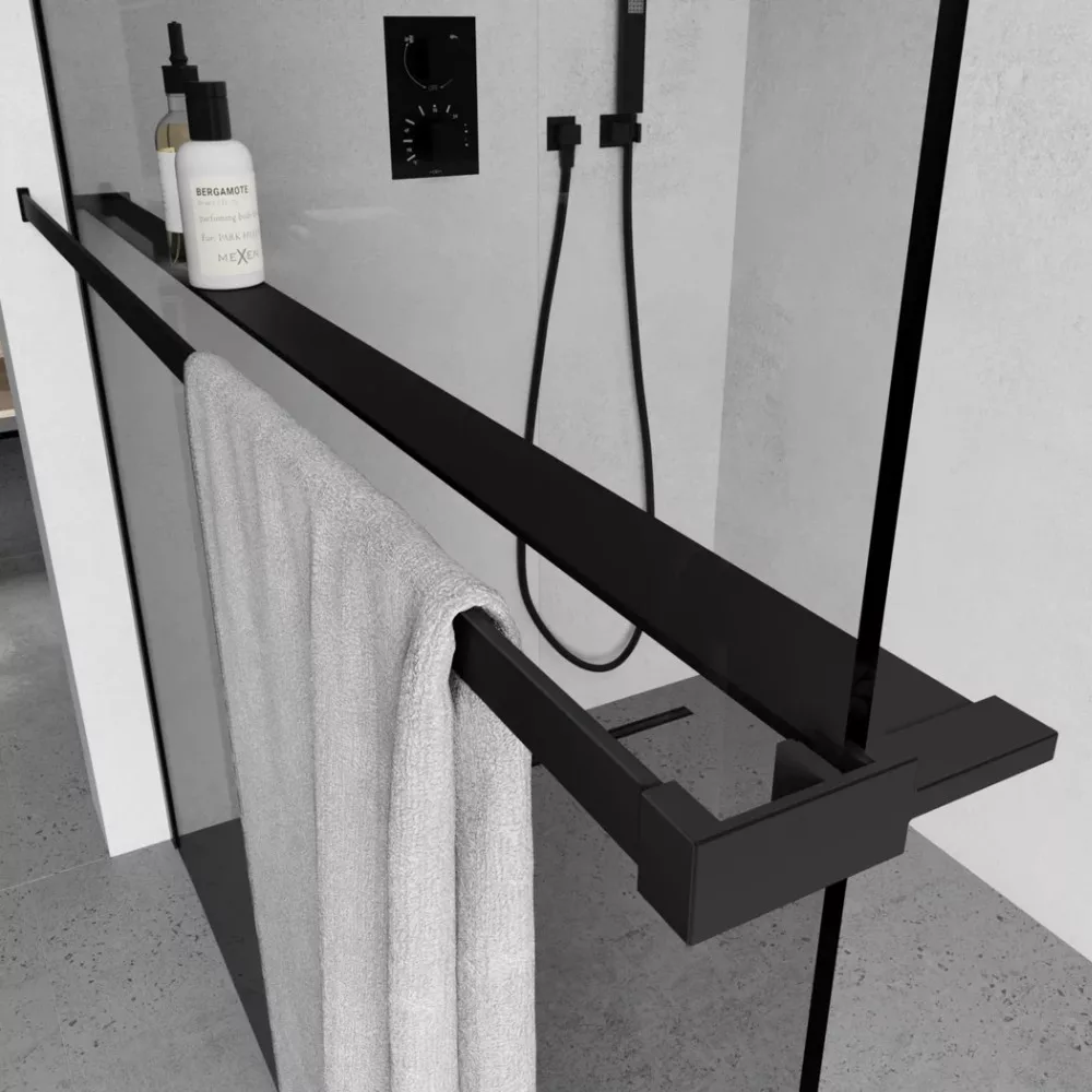 Az alumínium polc és törölközőtartó egy modern kiegészítő eleme a Walk-In zuhanyfalnak, amelyen nem csak designban hanem funkcionalitásában is kiemelkedő szereppel rendelkezik. A belső oldalon lehetősége elhelyezni a nap mint nap használt tusfürdőket, míg kivülről lehetőség adódik a törölközők szárítására és tárolására.