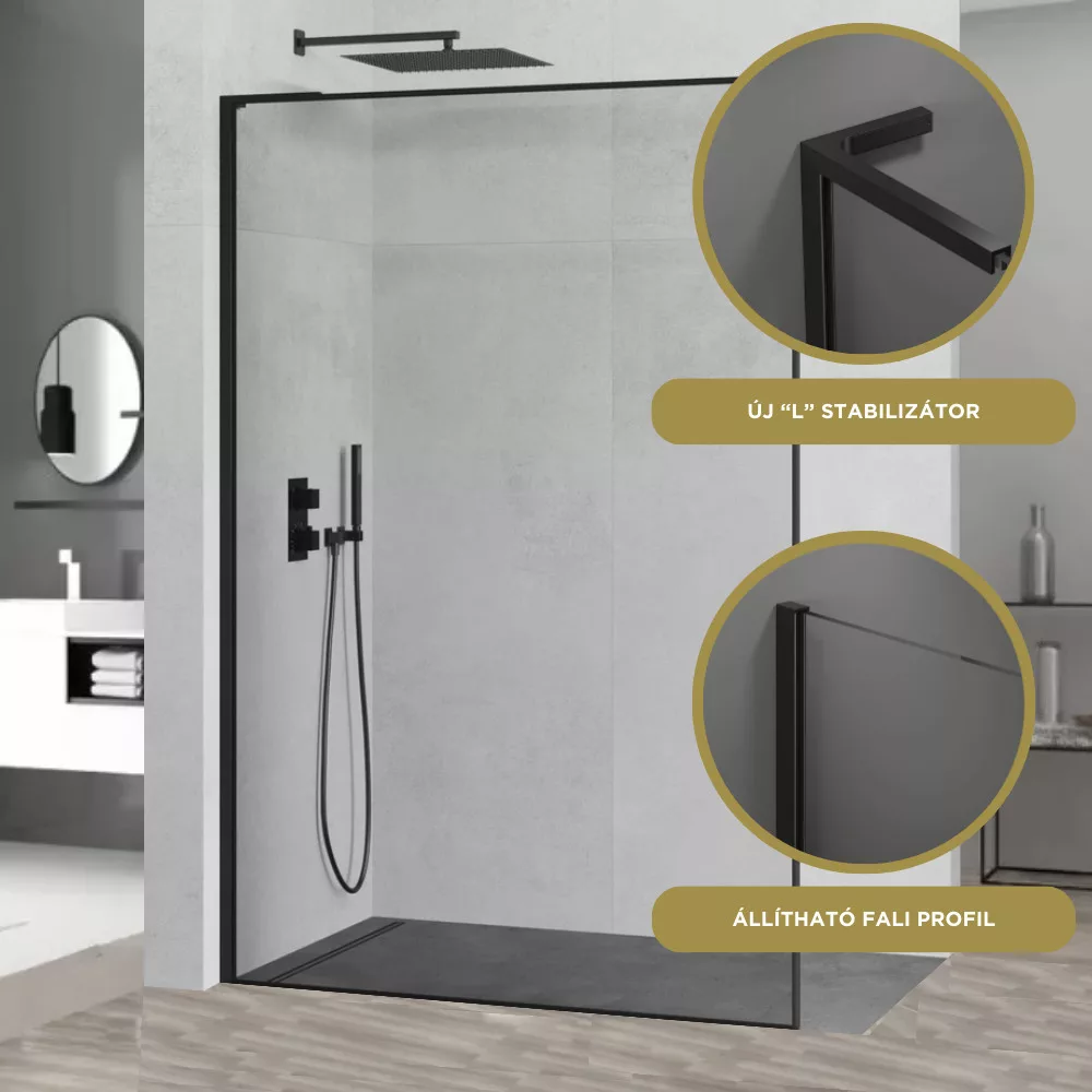 A mai modern stílusnak megfelelően alkottuk meg a visszafogott, mégis szemet gyönyörködtető Walk-In zuhanyfalunkat. Helyet kaphat bármilyen stílusú fürdőszobában, képes a belső összképhez hozzájárulni. A matt fekete színű profilok és "L" stabilizátor remek színárnyalatban készülnek el, ami a különböző megvilágítások alatt is kellemes érzetet keltenek.
