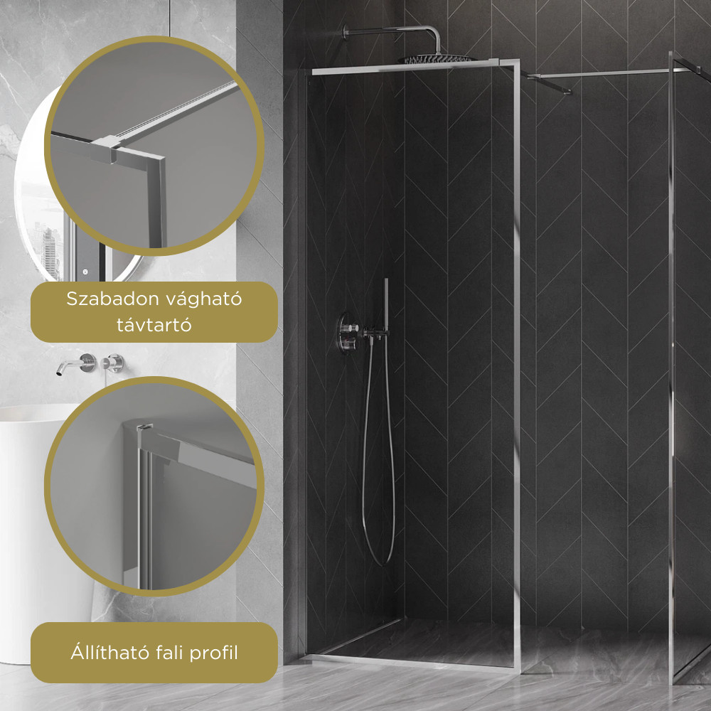A mai modern stílusnak megfelelően alkottuk meg a visszafogott, mégis szemet gyönyörködtető Walk-In zuhanyfalunkat. Helyet kaphat bármilyen stílusú fürdőszobában, képes a belső összképhez hozzájárulni. A króm színű profilok és távtartó remek színárnyalatban készülnek el, ami a különböző megvilágítások alatt is kellemes érzetet keltenek.