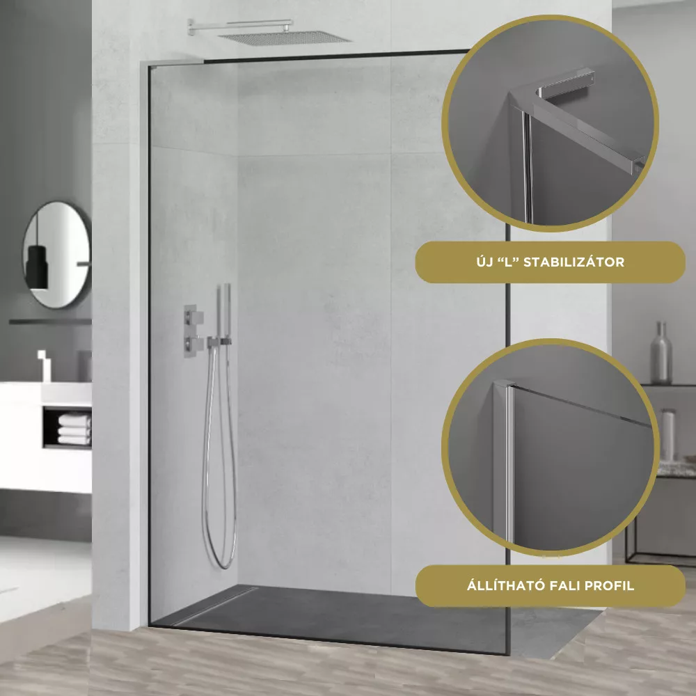 A mai modern stílusnak megfelelően alkottuk meg a visszafogott, mégis szemet gyönyörködtető Walk-In zuhanyfalunkat. Helyet kaphat bármilyen stílusú fürdőszobában, képes a belső összképhez hozzájárulni. A króm színű profilok és "L" stabilizátor remek színárnyalatban készülnek el, ami a különböző megvilágítások alatt is kellemes érzetet keltenek.