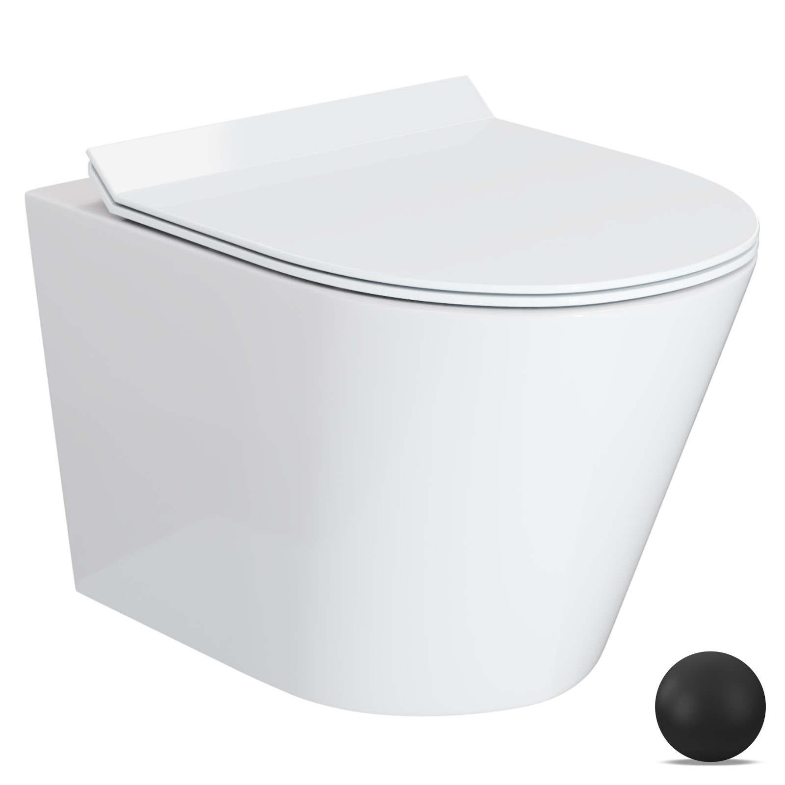 HD Madrid Glossy White perem nélküli mély öblítésű íves fali WC slim "F" tetővel és matt fekete zsanérral