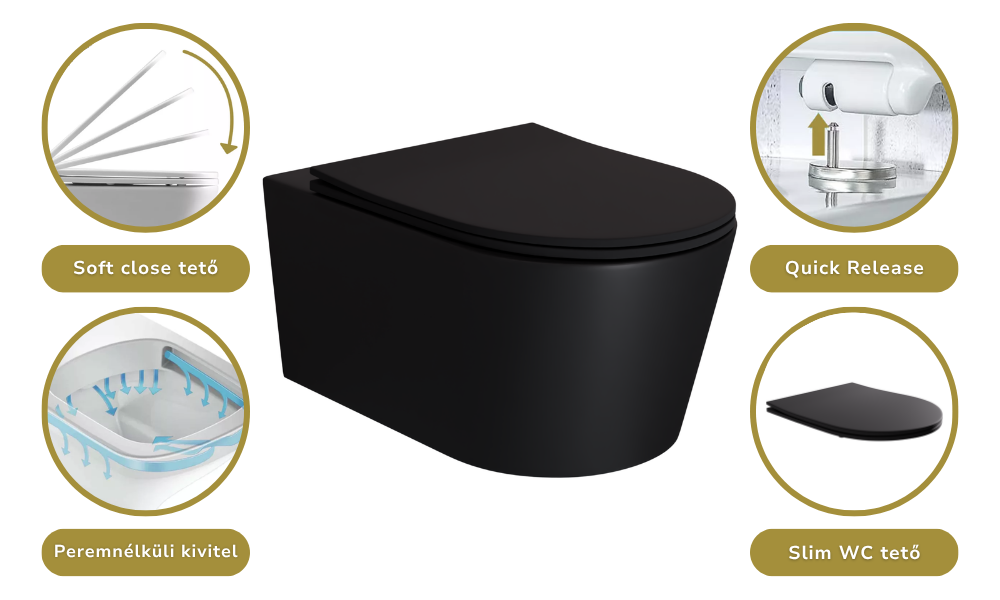 HD Noa Matt Black perem nélküli mély öblítésű íves fali WC slim "P" tetővel és matt fekete zsanérral
