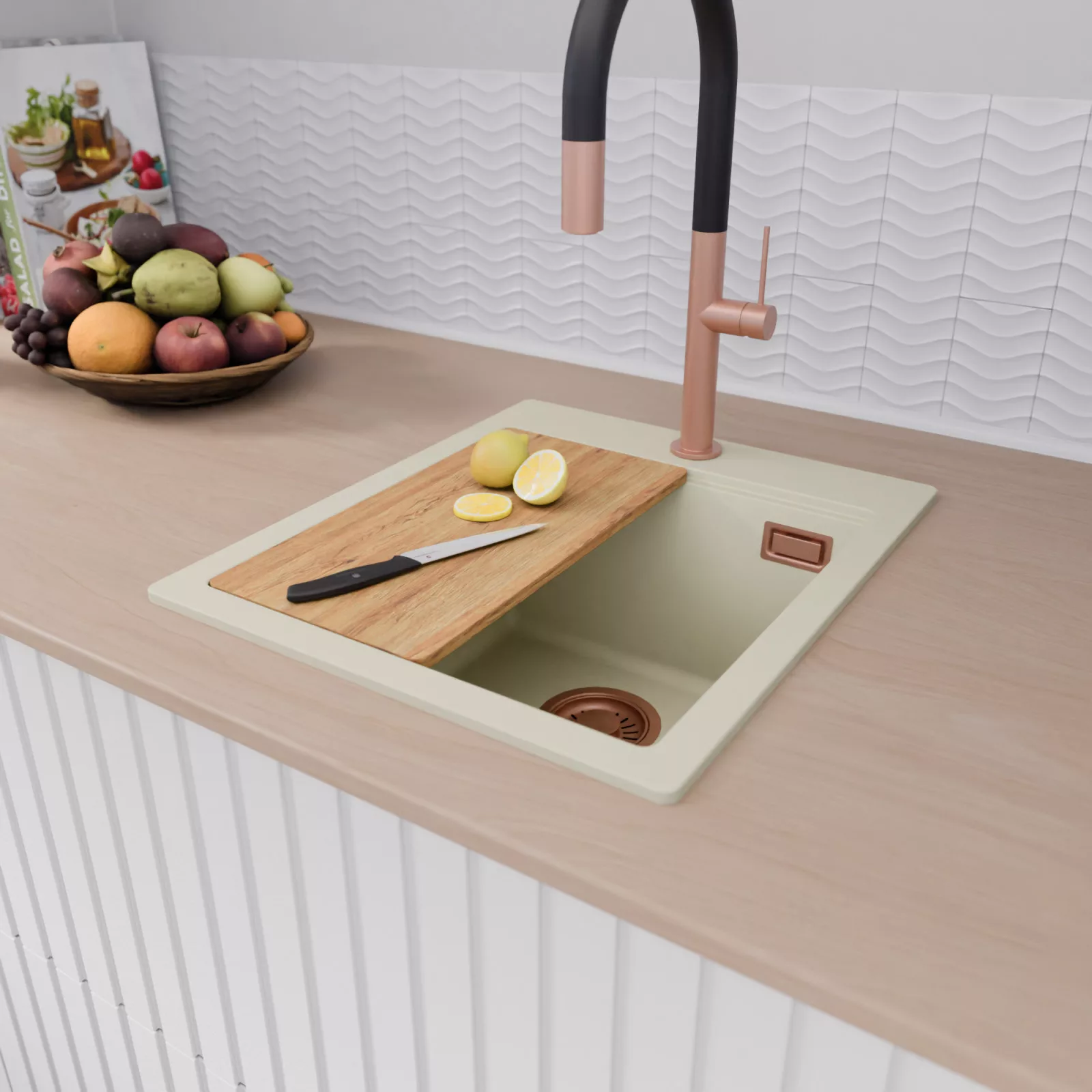 A mosogató prémium minőségű gránit kompozitból készült. Letisztult megjelenése mellett rendkívül praktikus, így bármilyen stílusú konyhába harmonikusan illeszkedik. A strapabíró gránit anyag hosszú távon is megbízható használatot garantál.