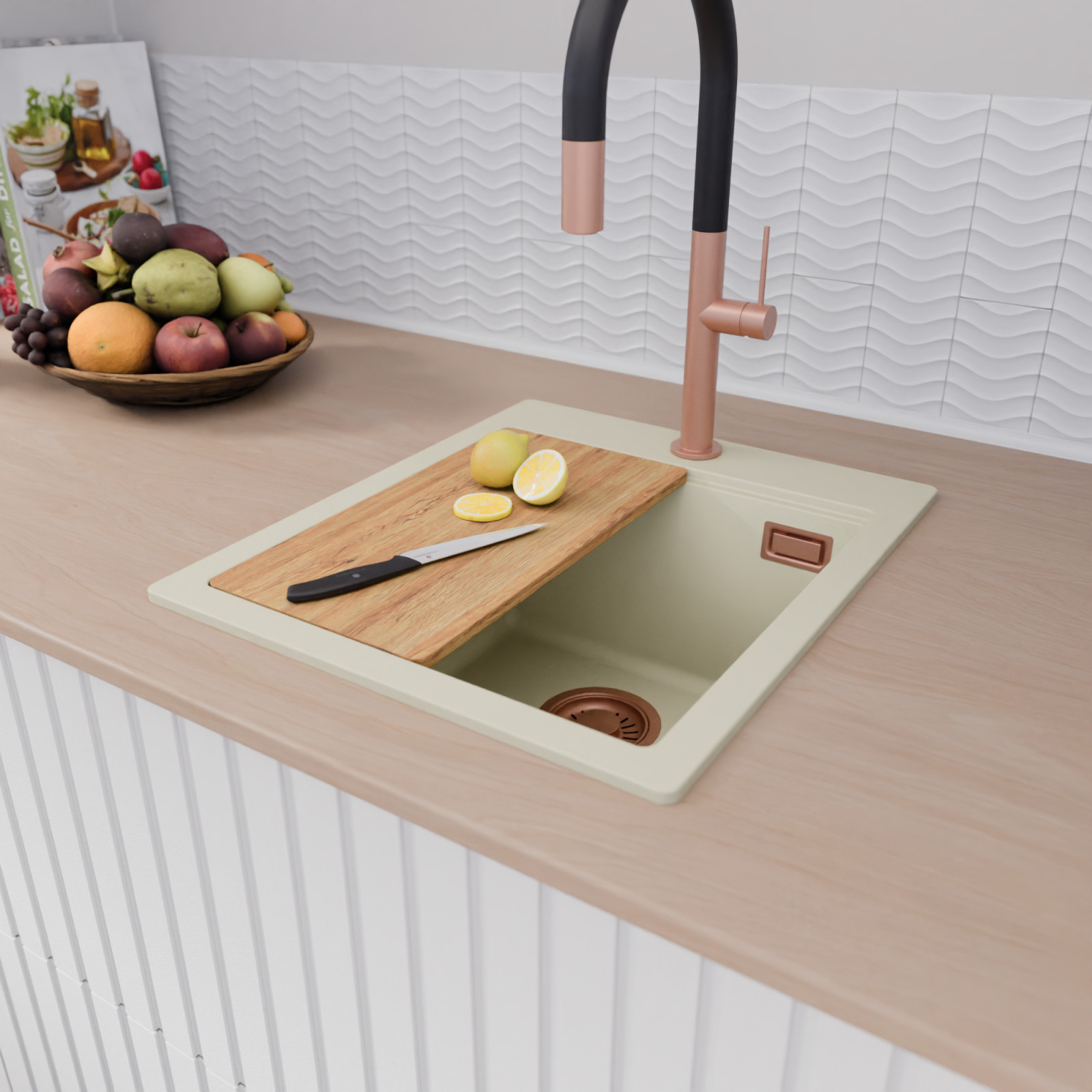 A mosogató prémium minőségű gránit kompozitból készült. Letisztult megjelenése mellett rendkívül praktikus, így bármilyen stílusú konyhába harmonikusan illeszkedik. A strapabíró gránit anyag hosszú távon is megbízható használatot garantál.