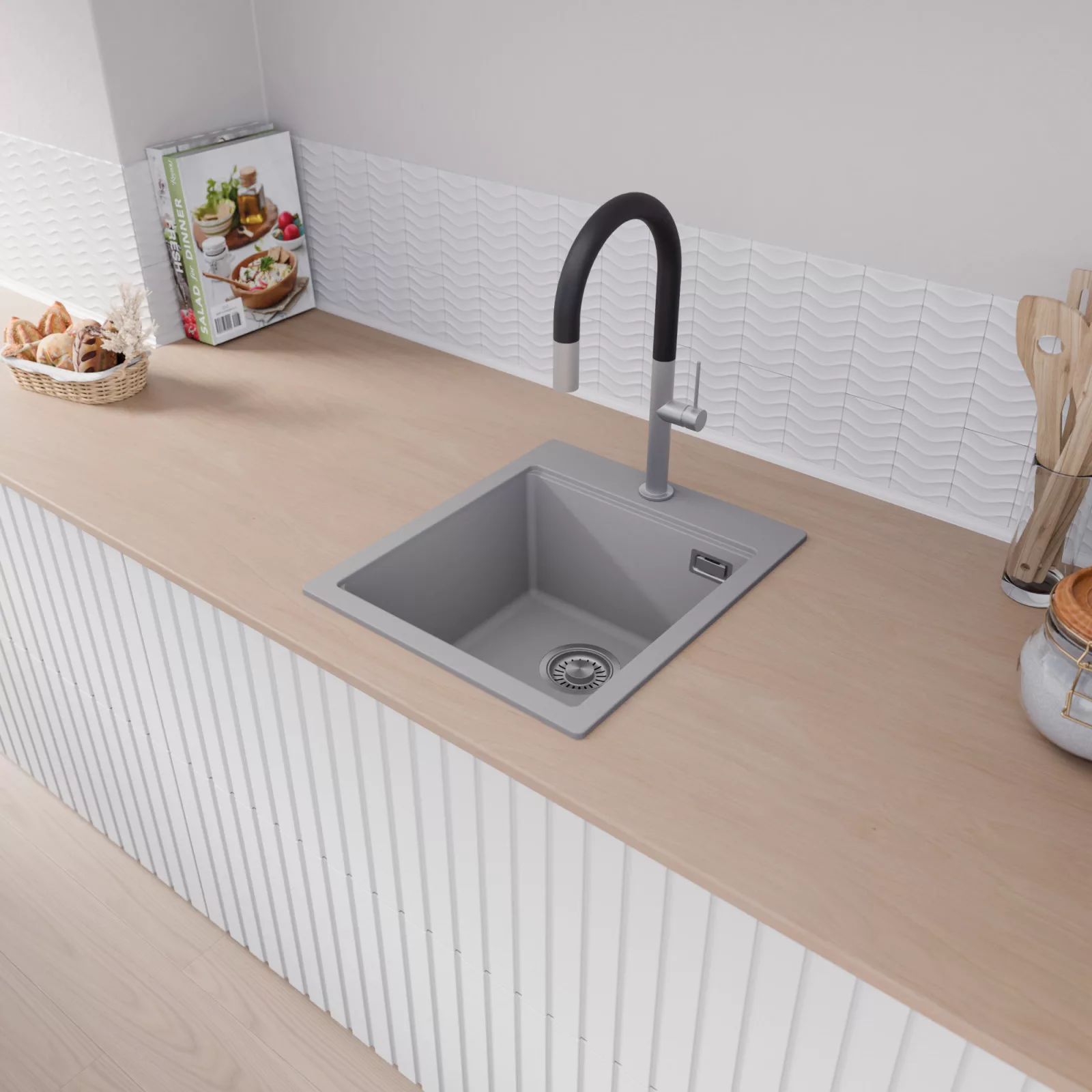 A mosogató prémium minőségű gránit kompozitból készült. Letisztult megjelenése mellett rendkívül praktikus, így bármilyen stílusú konyhába harmonikusan illeszkedik. A strapabíró gránit anyag hosszú távon is megbízható használatot garantál.