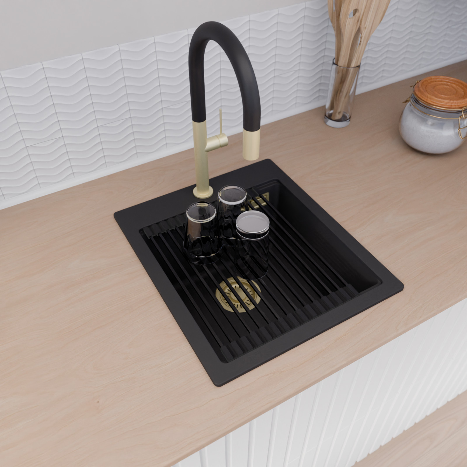A mosogató prémium minőségű gránit kompozitból készült. Letisztult megjelenése mellett rendkívül praktikus, így bármilyen stílusú konyhába harmonikusan illeszkedik. A strapabíró gránit anyag hosszú távon is megbízható használatot garantál.
