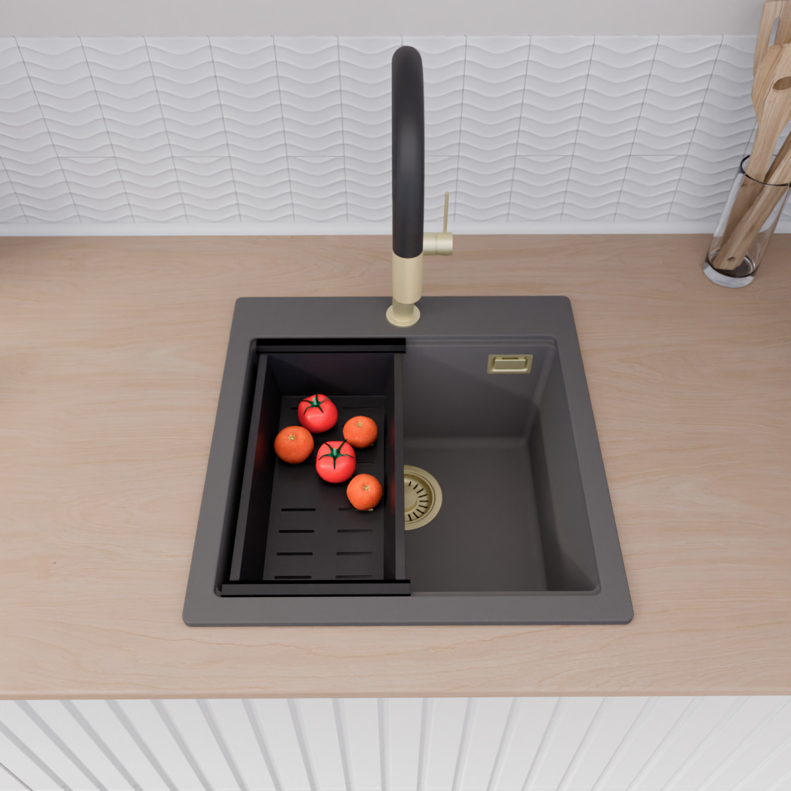 A mosogató prémium minőségű gránit kompozitból készült. Letisztult megjelenése mellett rendkívül praktikus, így bármilyen stílusú konyhába harmonikusan illeszkedik. A strapabíró gránit anyag hosszú távon is megbízható használatot garantál.