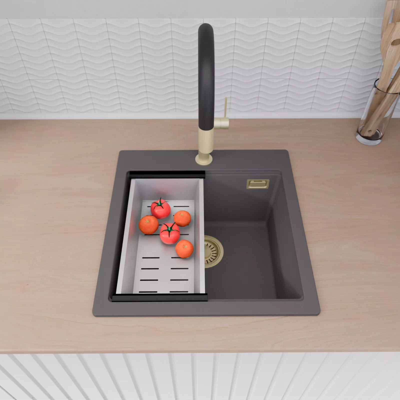 A mosogató prémium minőségű gránit kompozitból készült. Letisztult megjelenése mellett rendkívül praktikus, így bármilyen stílusú konyhába harmonikusan illeszkedik. A strapabíró gránit anyag hosszú távon is megbízható használatot garantál.