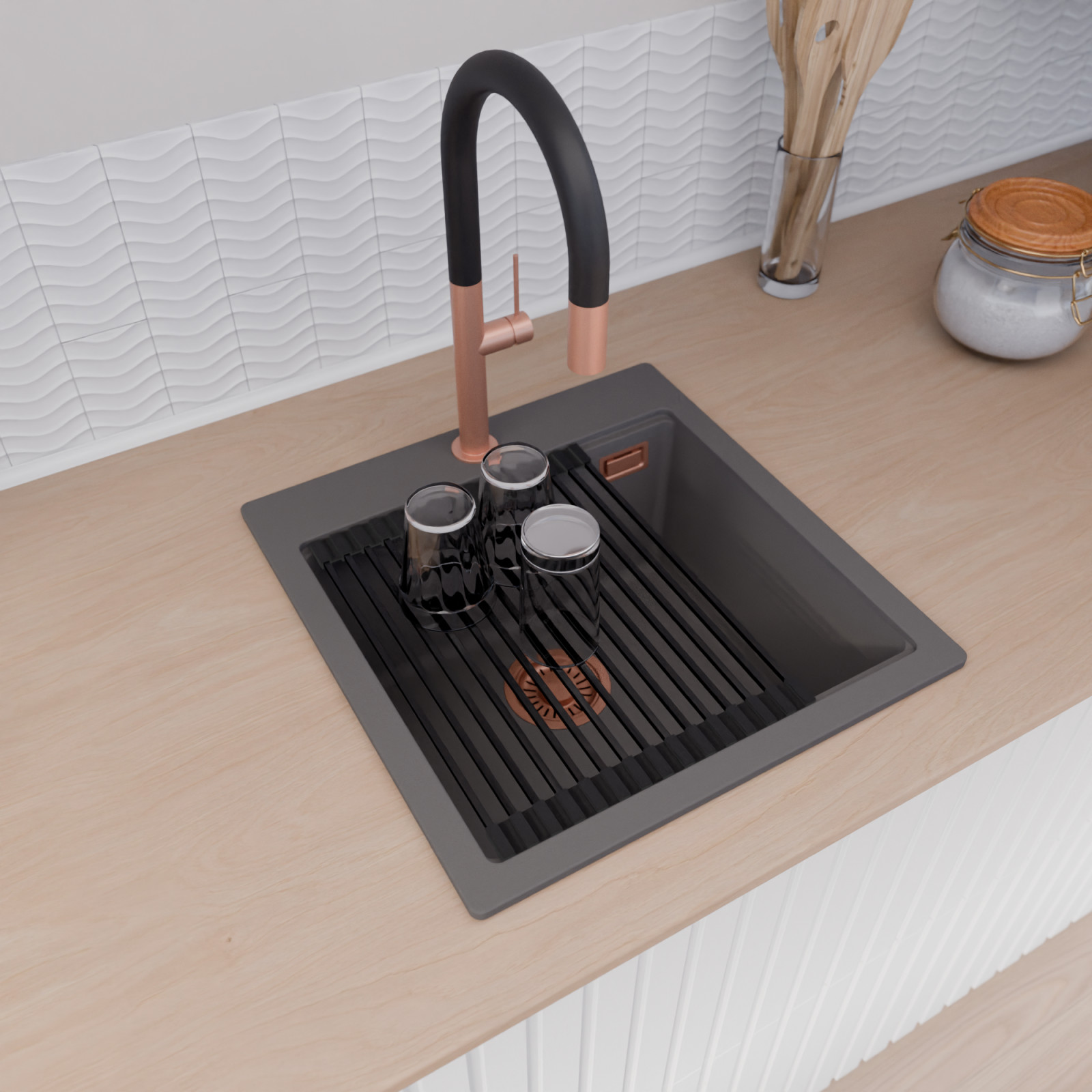 A mosogató prémium minőségű gránit kompozitból készült. Letisztult megjelenése mellett rendkívül praktikus, így bármilyen stílusú konyhába harmonikusan illeszkedik. A strapabíró gránit anyag hosszú távon is megbízható használatot garantál.