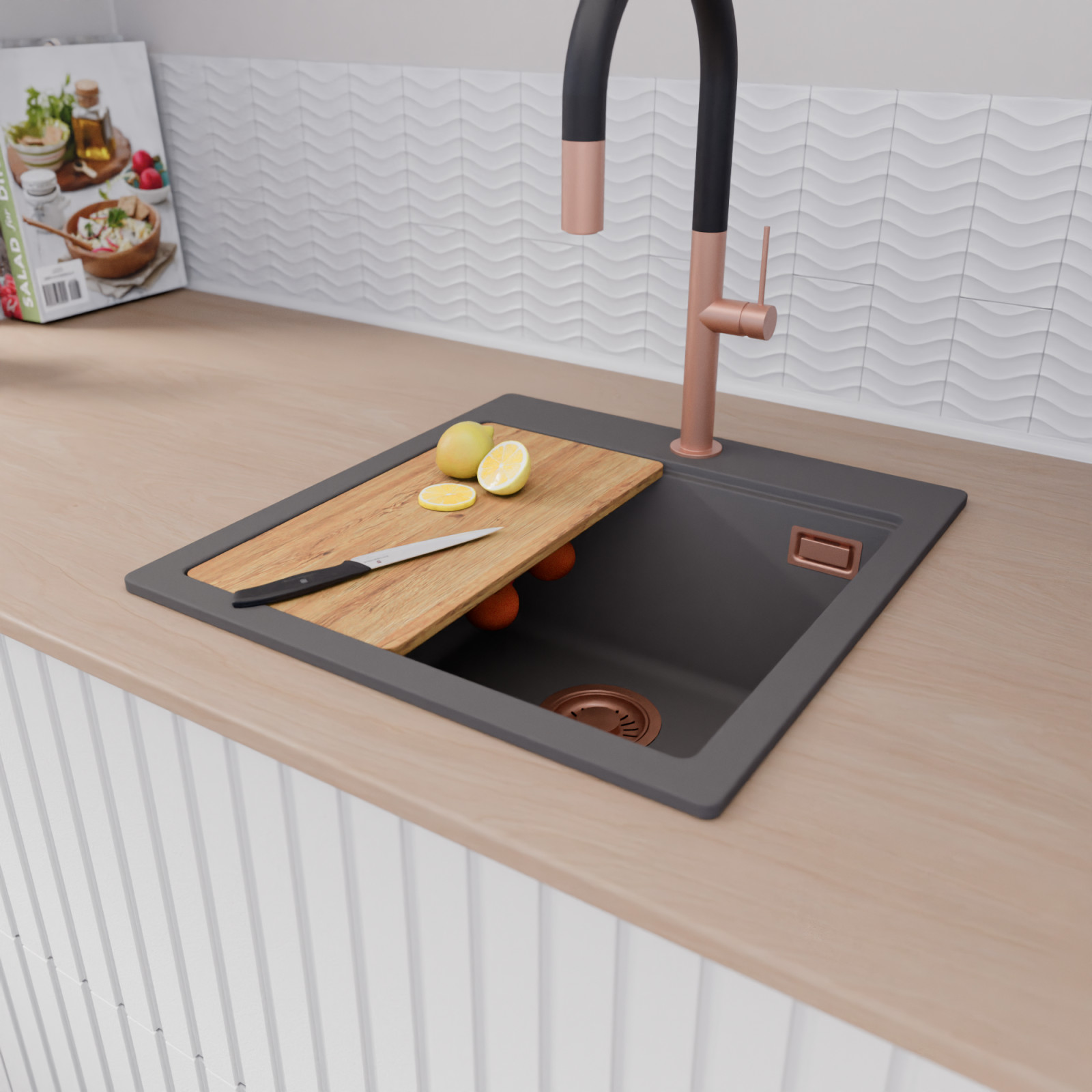 A mosogató prémium minőségű gránit kompozitból készült. Letisztult megjelenése mellett rendkívül praktikus, így bármilyen stílusú konyhába harmonikusan illeszkedik. A strapabíró gránit anyag hosszú távon is megbízható használatot garantál.
