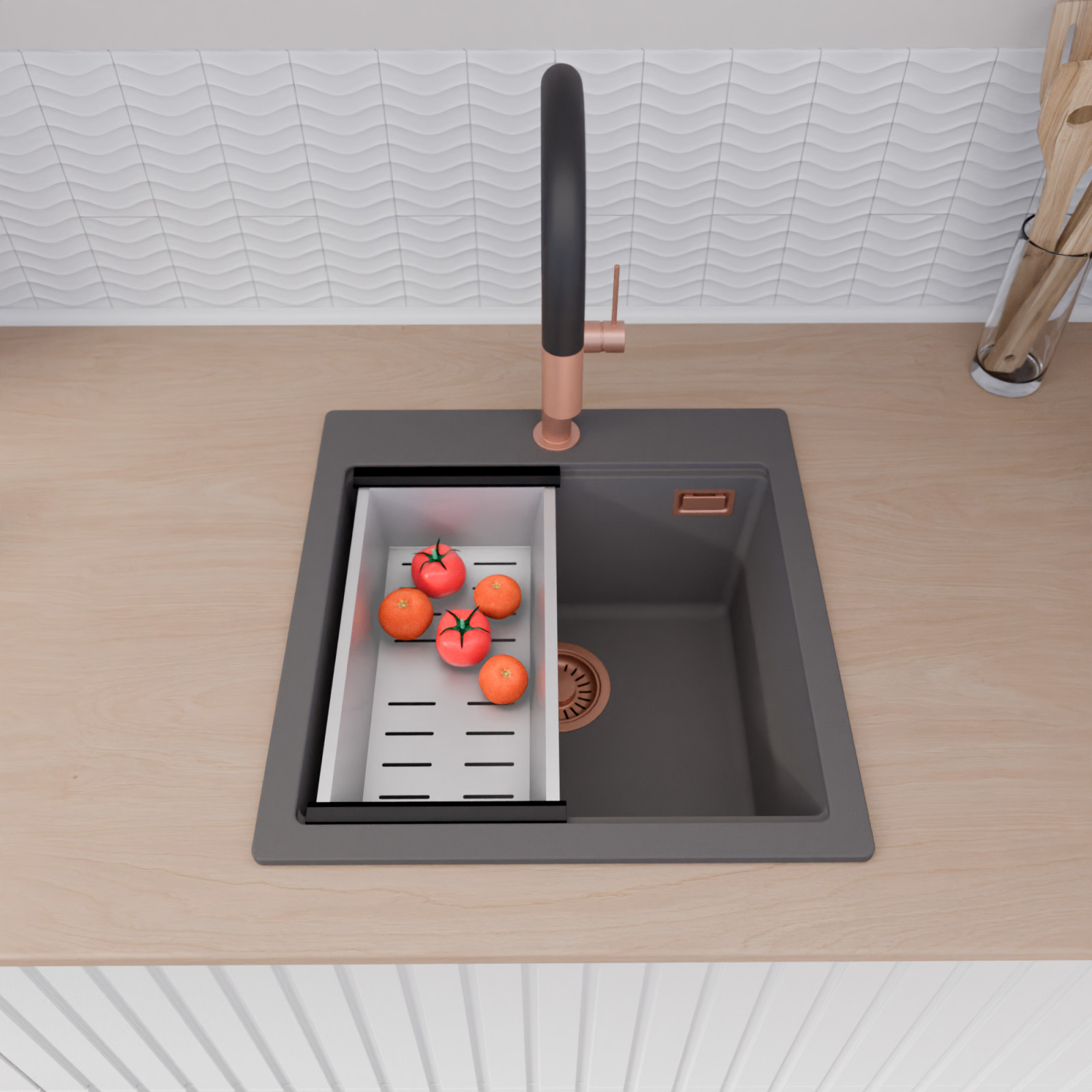 A mosogató prémium minőségű gránit kompozitból készült. Letisztult megjelenése mellett rendkívül praktikus, így bármilyen stílusú konyhába harmonikusan illeszkedik. A strapabíró gránit anyag hosszú távon is megbízható használatot garantál.