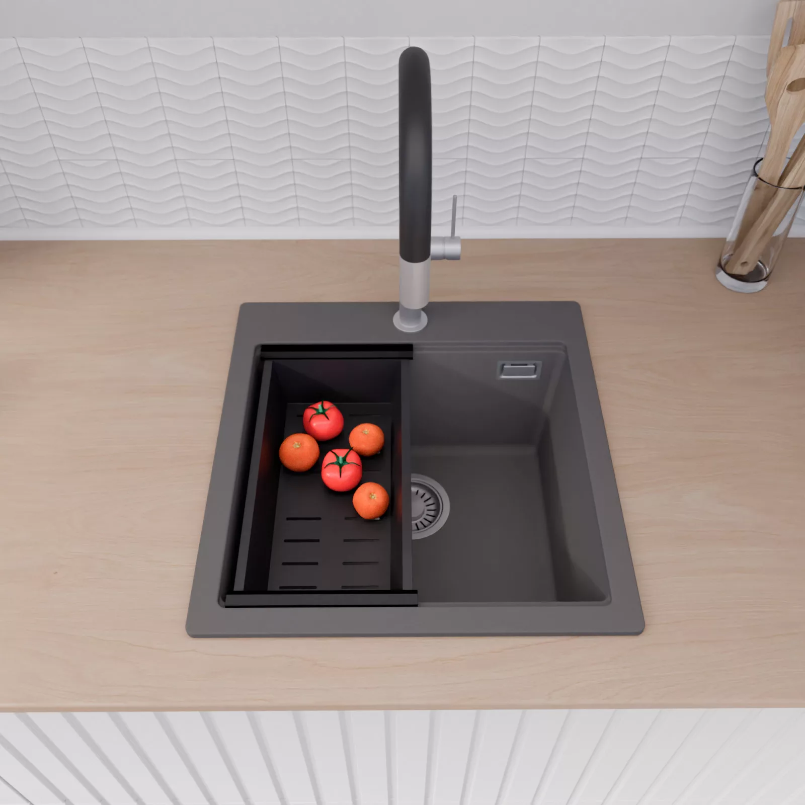 A mosogató prémium minőségű gránit kompozitból készült. Letisztult megjelenése mellett rendkívül praktikus, így bármilyen stílusú konyhába harmonikusan illeszkedik. A strapabíró gránit anyag hosszú távon is megbízható használatot garantál.
