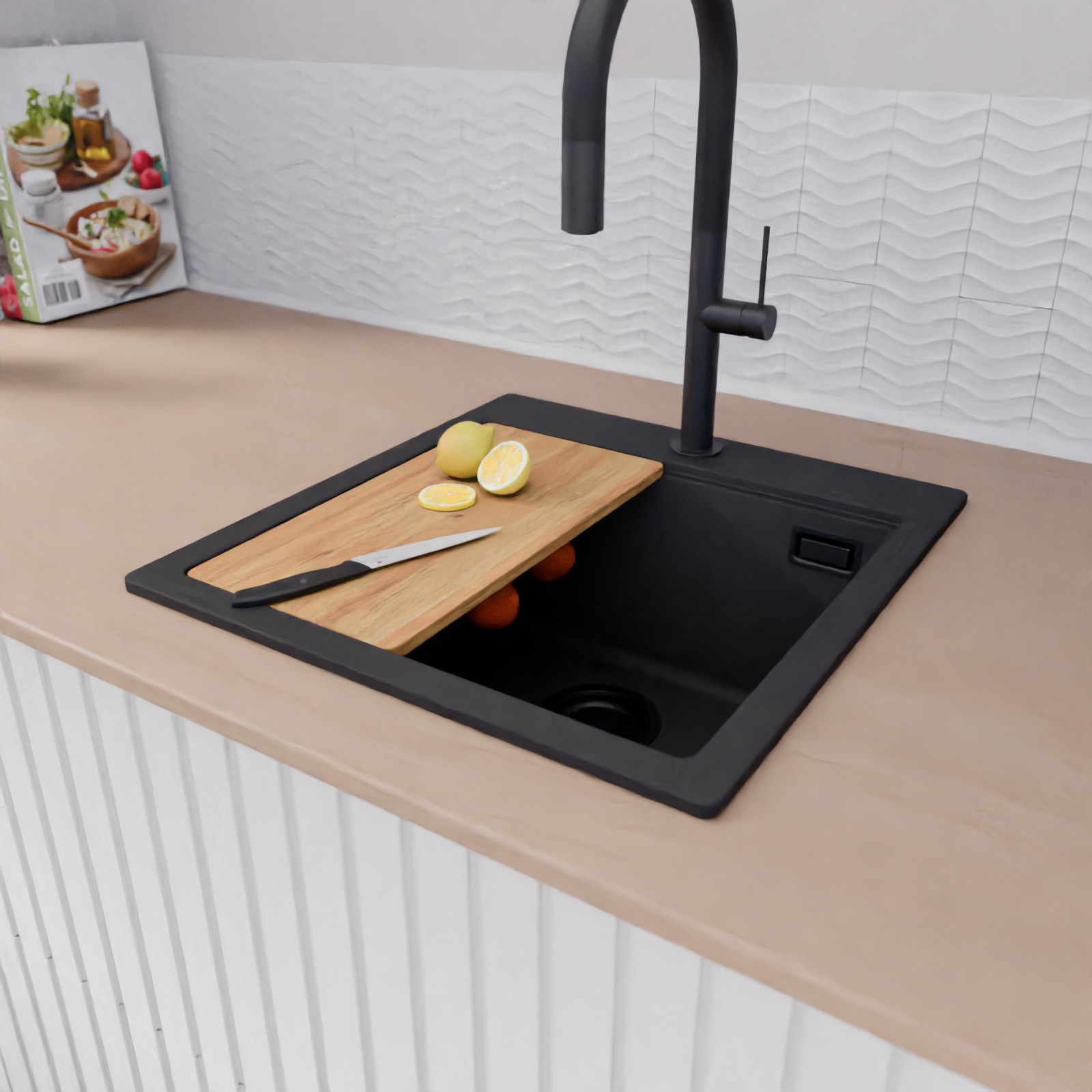 A mosogató prémium minőségű gránit kompozitból készült. Letisztult megjelenése mellett rendkívül praktikus, így bármilyen stílusú konyhába harmonikusan illeszkedik. A strapabíró gránit anyag hosszú távon is megbízható használatot garantál.