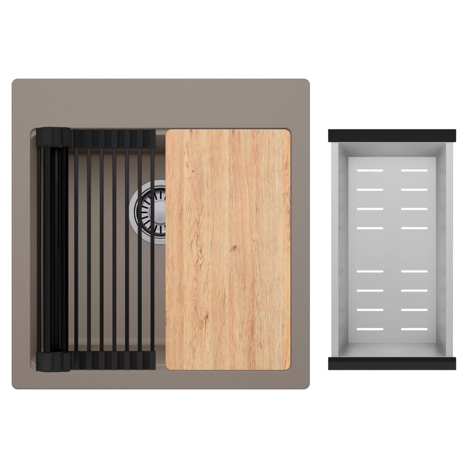 HD Infinity Tortora 48 egymedencés mosogatótálca szett, vágódeszkával, csepegtetőráccsal és kosárral, tortora