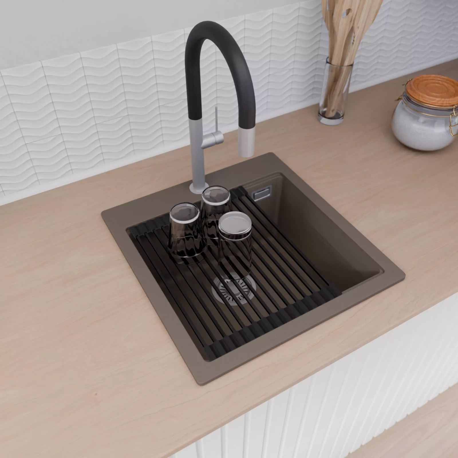 A mosogató prémium minőségű gránit kompozitból készült. Letisztult megjelenése mellett rendkívül praktikus, így bármilyen stílusú konyhába harmonikusan illeszkedik. A strapabíró gránit anyag hosszú távon is megbízható használatot garantál.