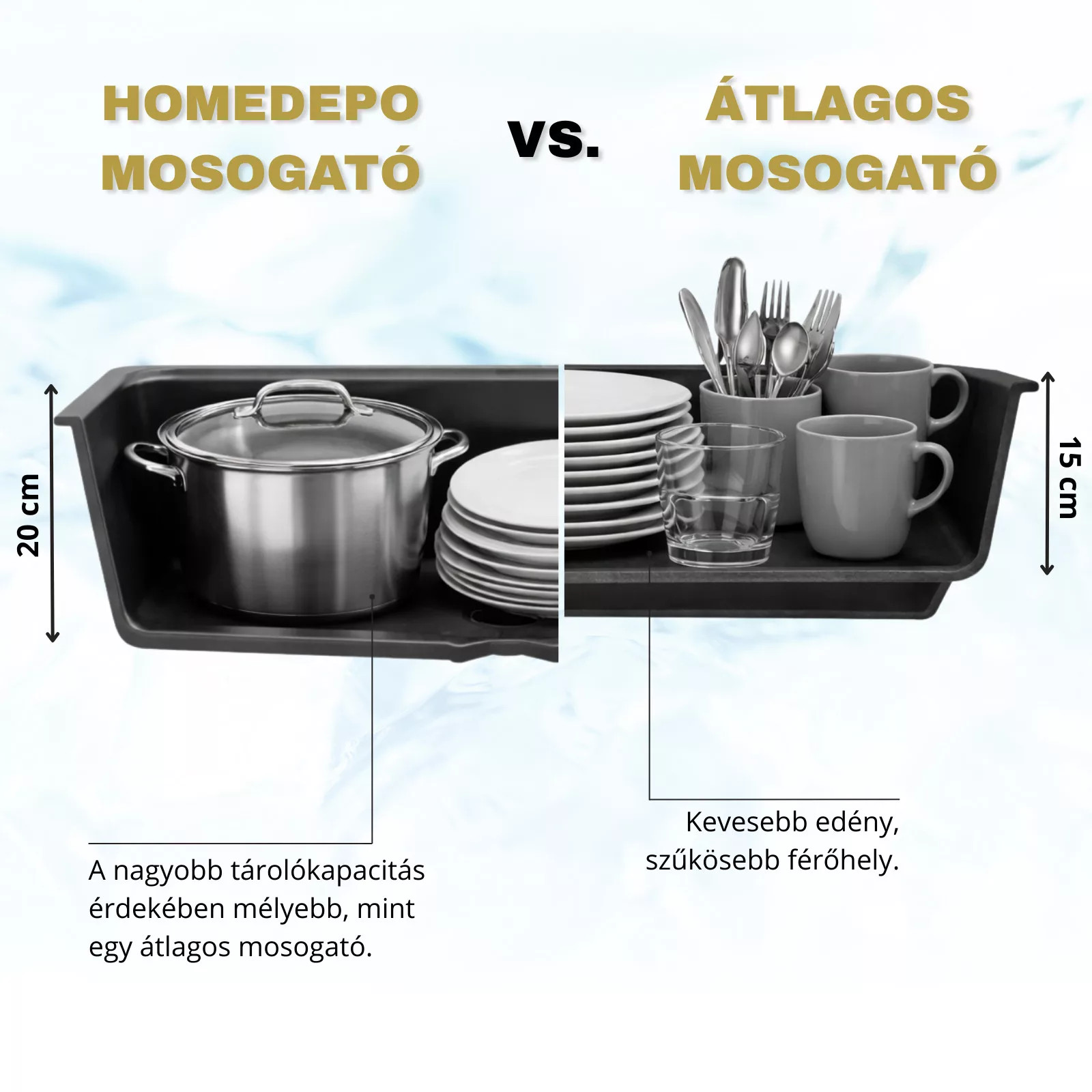 A HomeDepo SmartEdge Többfunkciós Peremrendszer egy intelligensen kialakított peremmegoldás, amely a mosogatót kompakt, mégis teljes értékű konyhai térré alakítja a mindennapok során. A speciális peremkialakítás lehetővé teszi a vágódeszka, a feltekerhető csepegtető rács, a gyümölcsmosó és a csepegtető kosár stabil, biztonságos és kényelmes elhelyezését közvetlenül a mosogató speciális belső peremén. A kiegészítők síkban csúsztathatók és szabadon kombinálhatók, így extra munkafelületet nyersz anélkül, hogy helyet foglalnál a konyhapulton – a mosogató valódi többfunkciós központtá válik.