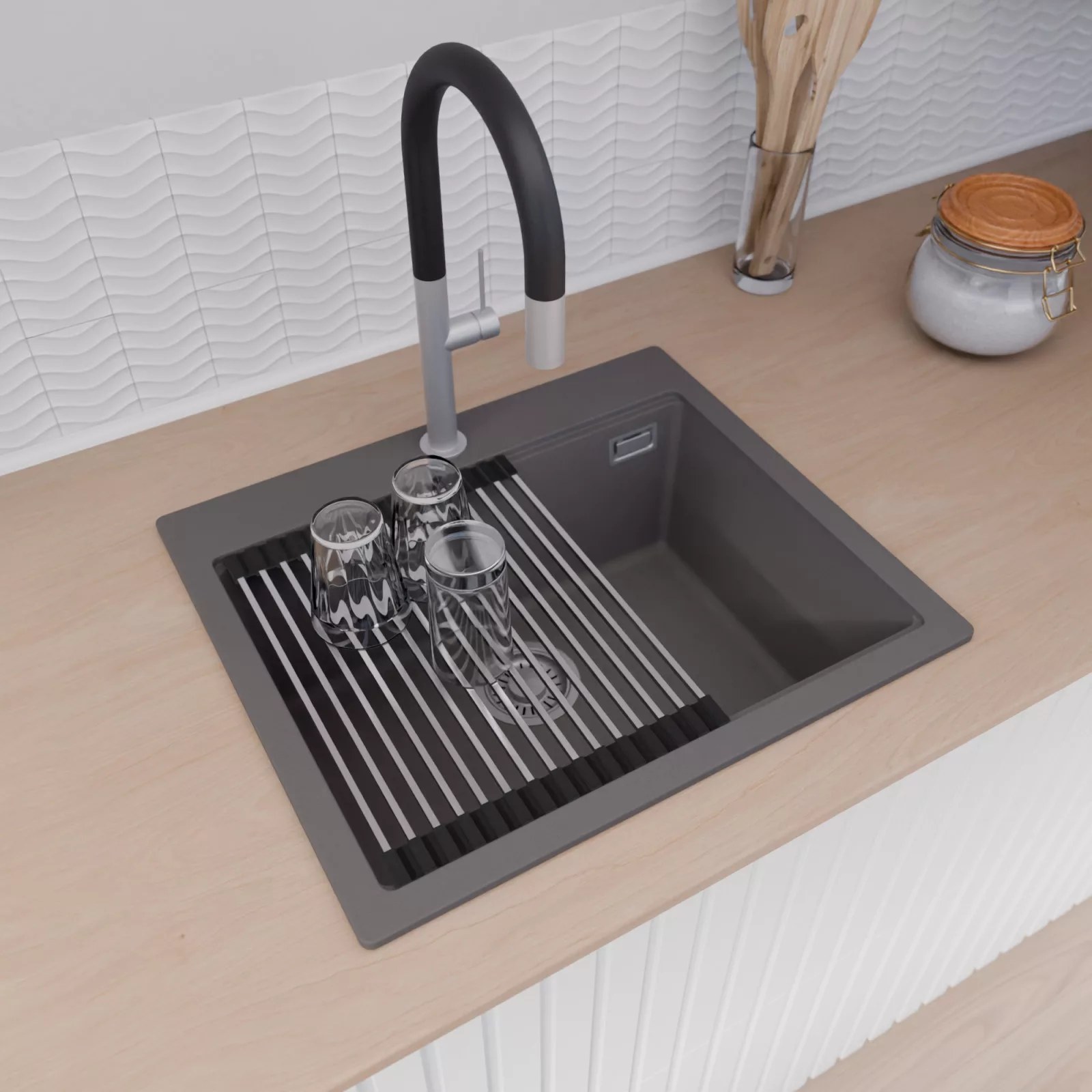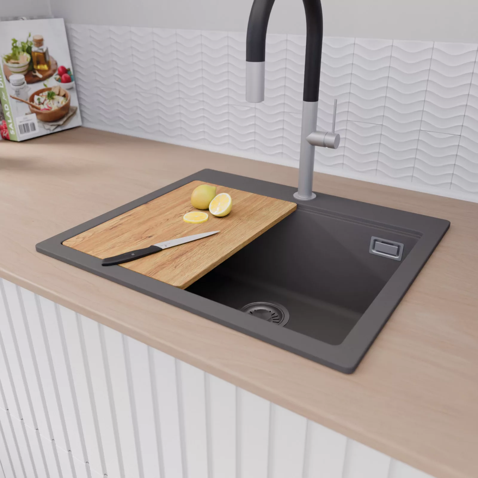 A mosogató prémium minőségű gránit kompozitból készült. Letisztult megjelenése mellett rendkívül praktikus, így bármilyen stílusú konyhába harmonikusan illeszkedik. A strapabíró gránit anyag hosszú távon is megbízható használatot garantál.