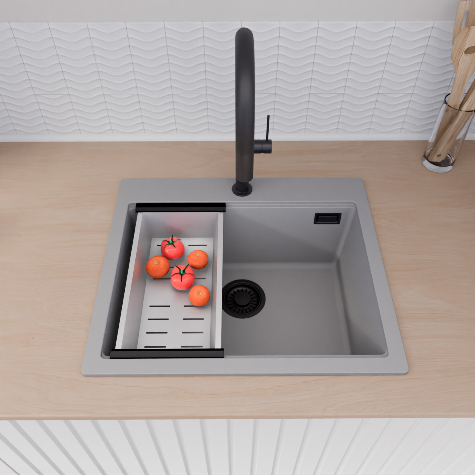 A mosogató prémium minőségű gránit kompozitból készült. Letisztult megjelenése mellett rendkívül praktikus, így bármilyen stílusú konyhába harmonikusan illeszkedik. A strapabíró gránit anyag hosszú távon is megbízható használatot garantál.
