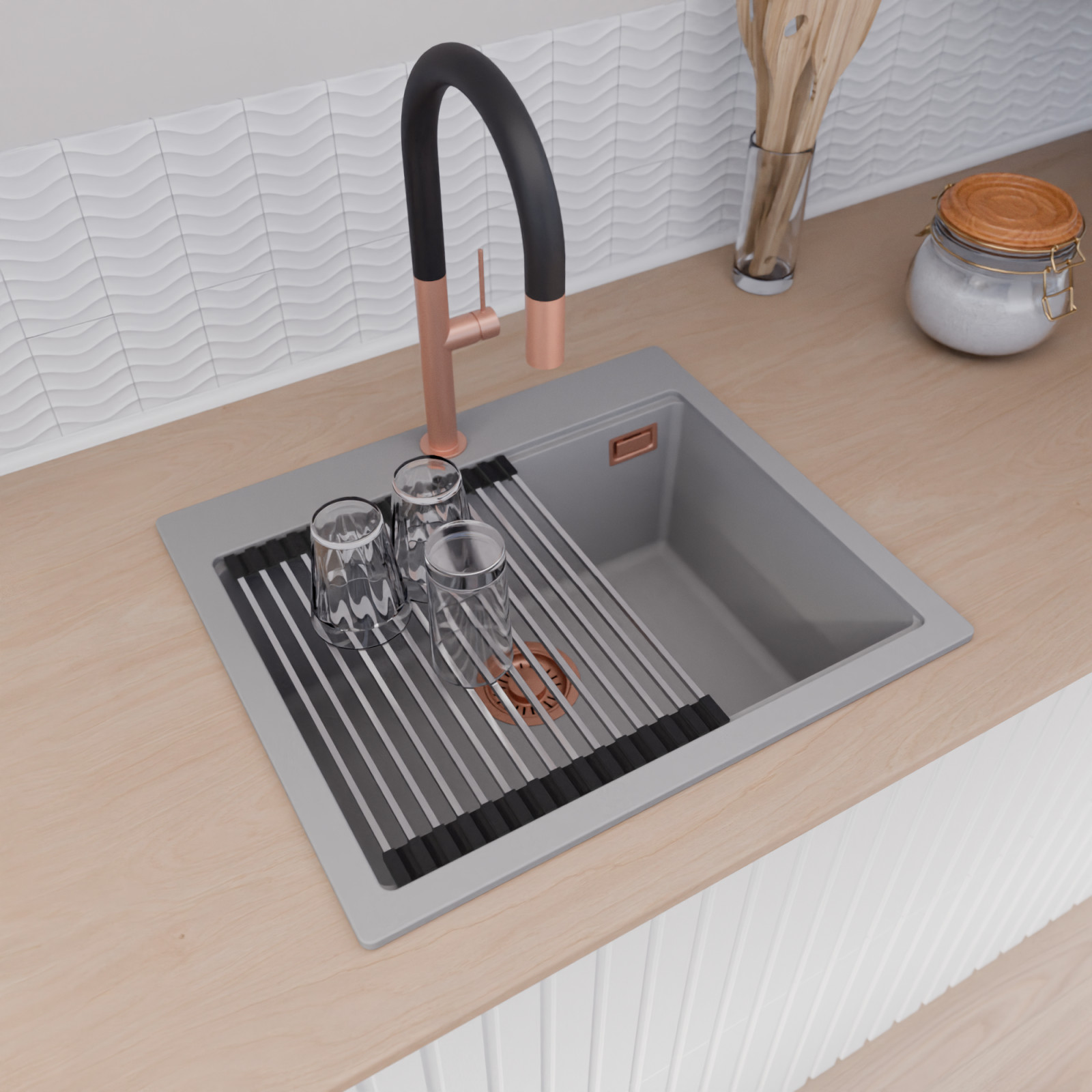A mosogató prémium minőségű gránit kompozitból készült. Letisztult megjelenése mellett rendkívül praktikus, így bármilyen stílusú konyhába harmonikusan illeszkedik. A strapabíró gránit anyag hosszú távon is megbízható használatot garantál.