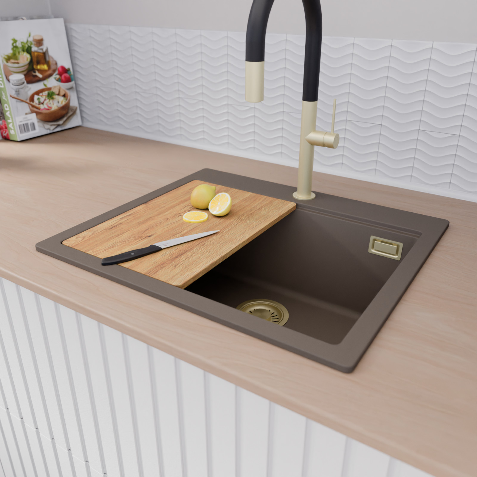 A mosogató prémium minőségű gránit kompozitból készült. Letisztult megjelenése mellett rendkívül praktikus, így bármilyen stílusú konyhába harmonikusan illeszkedik. A strapabíró gránit anyag hosszú távon is megbízható használatot garantál.