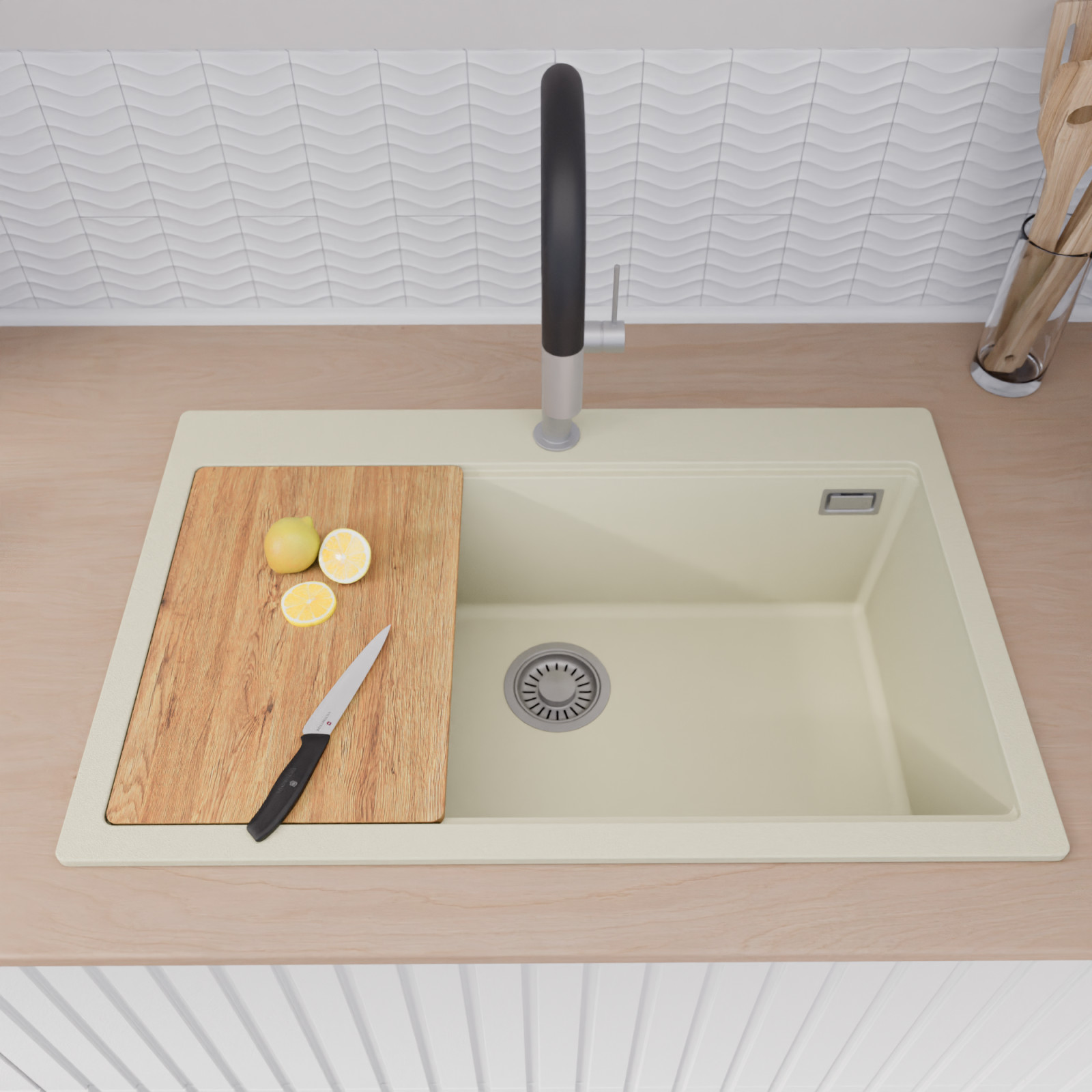 A mosogató prémium minőségű gránit kompozitból készült. Letisztult megjelenése mellett rendkívül praktikus, így bármilyen stílusú konyhába harmonikusan illeszkedik. A strapabíró gránit anyag hosszú távon is megbízható használatot garantál.