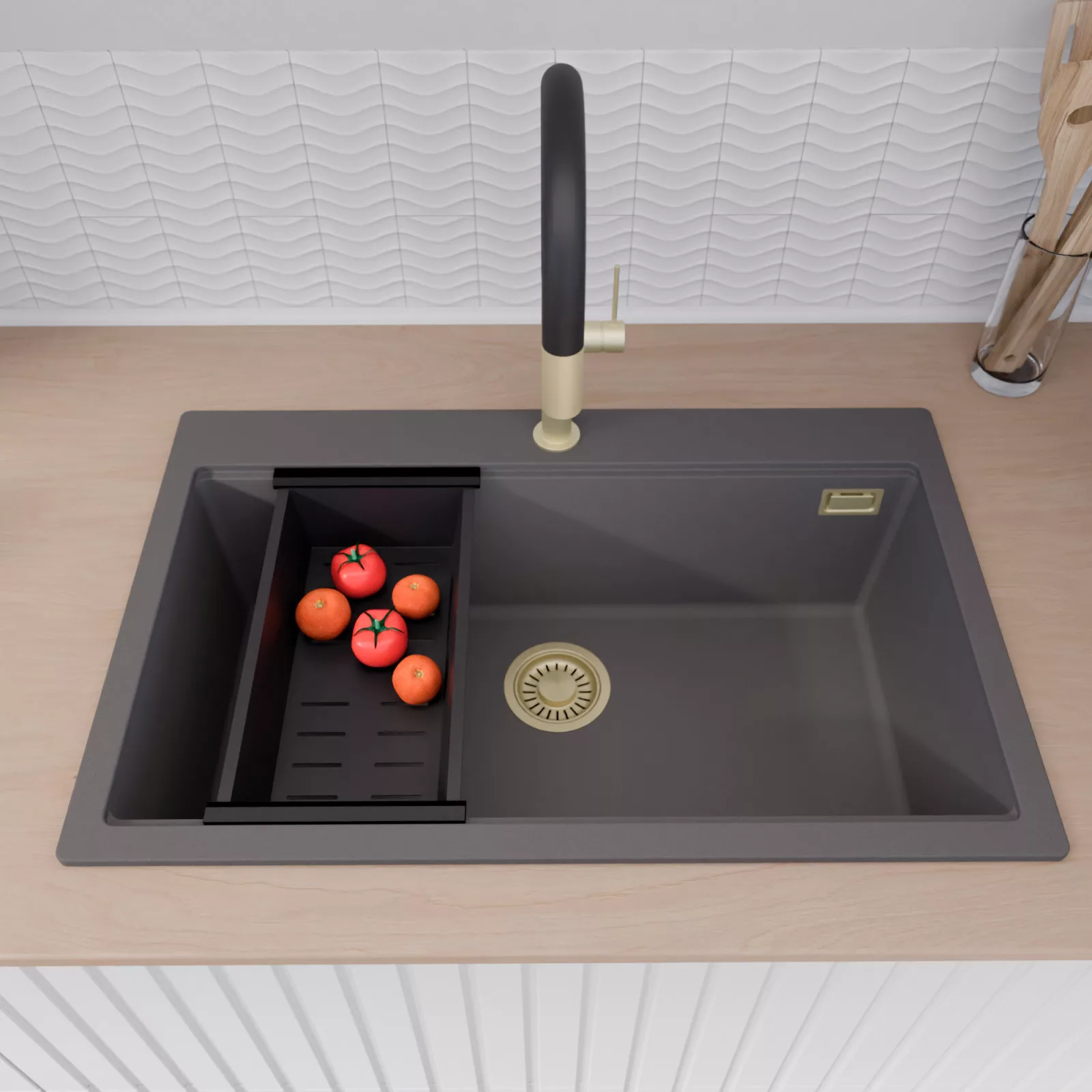 A mosogató prémium minőségű gránit kompozitból készült. Letisztult megjelenése mellett rendkívül praktikus, így bármilyen stílusú konyhába harmonikusan illeszkedik. A strapabíró gránit anyag hosszú távon is megbízható használatot garantál.