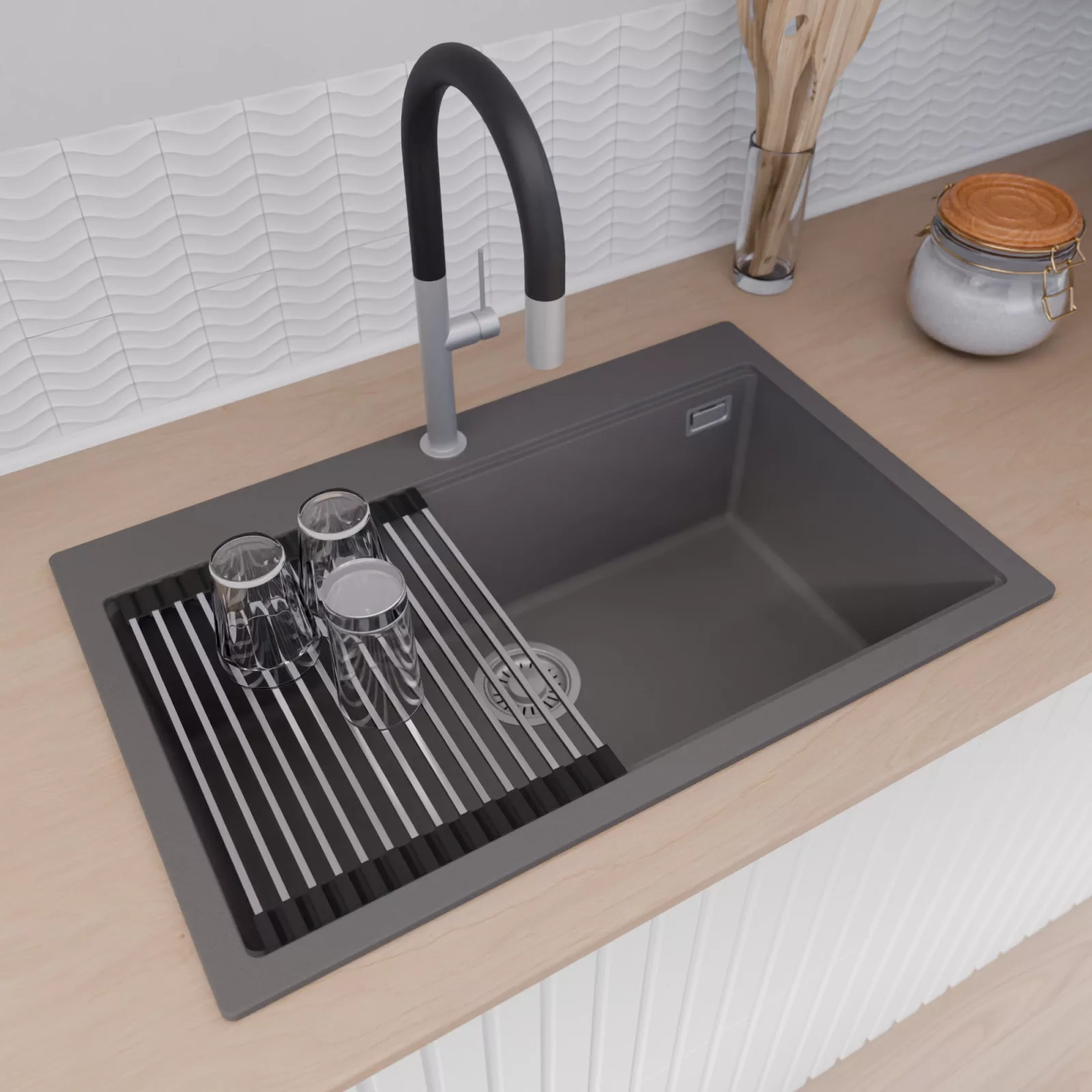 A mosogató prémium minőségű gránit kompozitból készült. Letisztult megjelenése mellett rendkívül praktikus, így bármilyen stílusú konyhába harmonikusan illeszkedik. A strapabíró gránit anyag hosszú távon is megbízható használatot garantál.