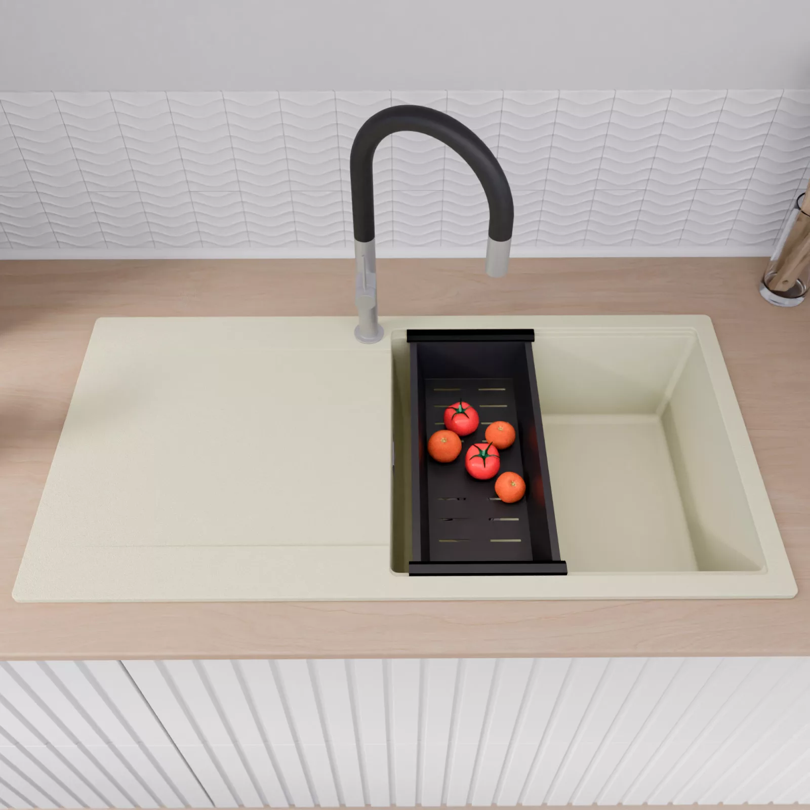 A mosogató prémium minőségű gránit kompozitból készült. Letisztult megjelenése mellett rendkívül praktikus, így bármilyen stílusú konyhába harmonikusan illeszkedik. A strapabíró gránit anyag hosszú távon is megbízható használatot garantál.
