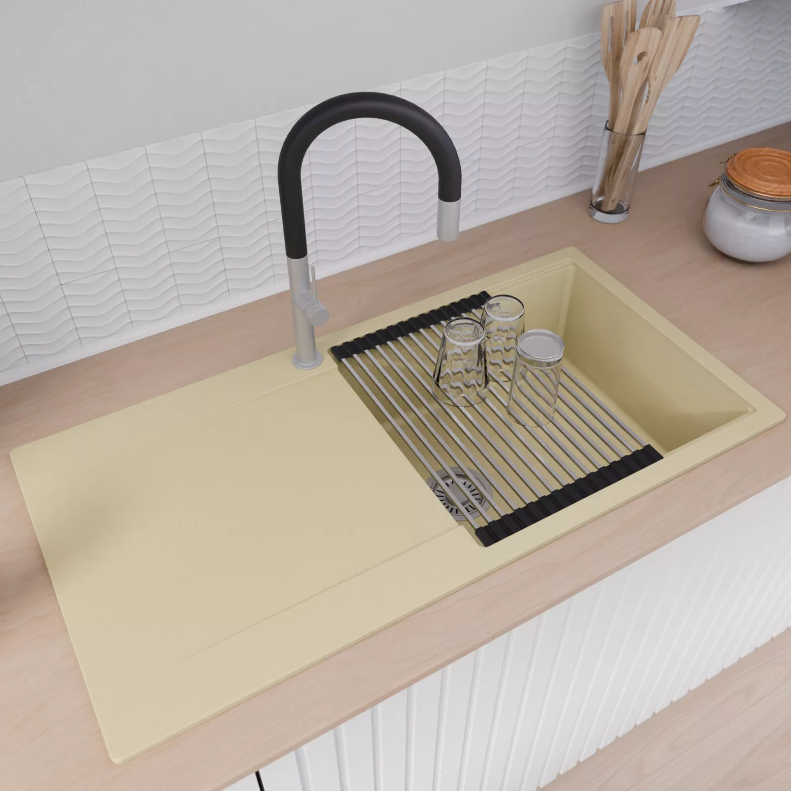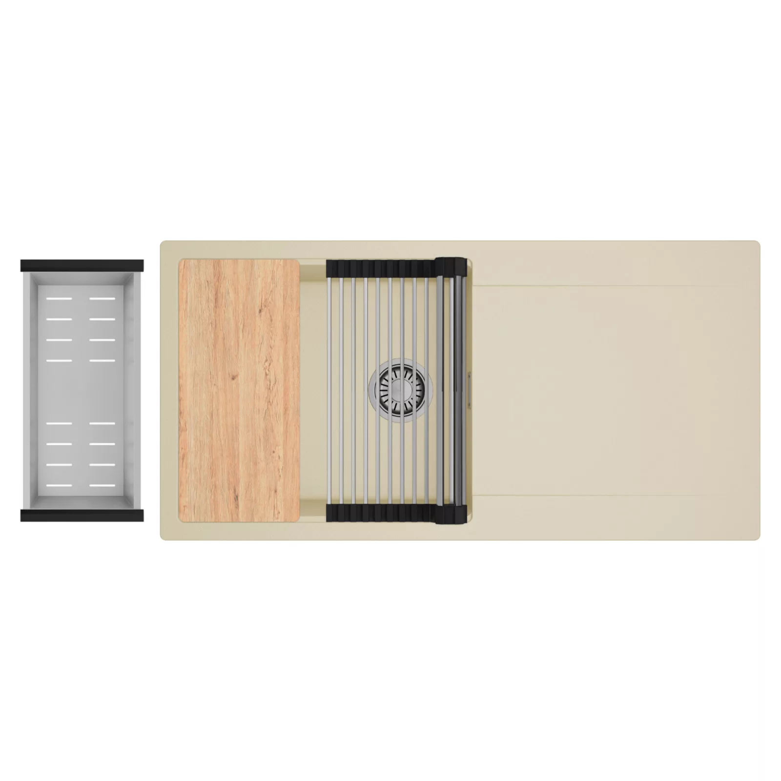 HD Onyx Beige 100 egymedencés mosogatótálca szett, vágódeszkával, csepegtetőráccsal és kosárral, soft bézs