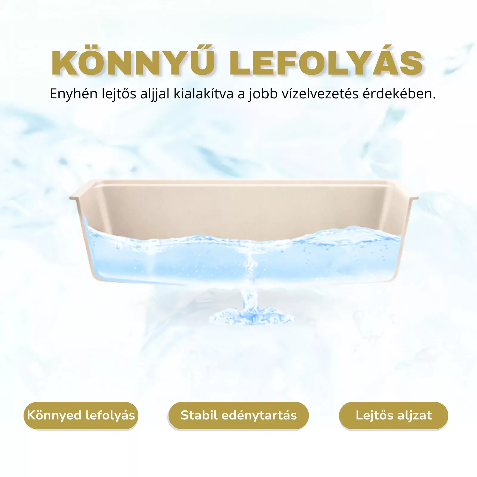 Mosogatónk magas természetes kőőrlemény-tartalmú gránit kompozitból készül, amely rendkívüli stabilitást és tartósságot biztosít. Az anyag ellenáll a magas hőmérsékletnek, a hirtelen hőingadozásoknak, valamint az ütéseknek és karcolásoknak is. Sima, zárt felülete könnyen tisztán tartható, ellenáll a foltosodásnak és az elszíneződéseknek, így hosszú éveken át megőrzi esztétikus megjelenését. Meggyőződésünk, hogy ezzel a gránit mosogatóval a mindennapi konyhai teendők kényelmesebbé és élvezetesebbé válnak.