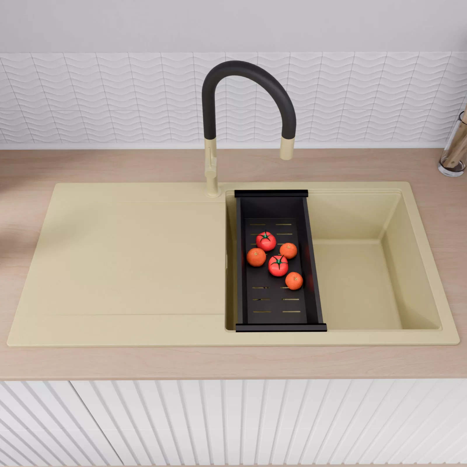 Mosogatónk magas természetes kőőrlemény-tartalmú gránit kompozitból készül, amely rendkívüli stabilitást és tartósságot biztosít. Az anyag ellenáll a magas hőmérsékletnek, a hirtelen hőingadozásoknak, valamint az ütéseknek és karcolásoknak is. Sima, zárt felülete könnyen tisztán tartható, ellenáll a foltosodásnak és az elszíneződéseknek, így hosszú éveken át megőrzi esztétikus megjelenését. Meggyőződésünk, hogy ezzel a gránit mosogatóval a mindennapi konyhai teendők kényelmesebbé és élvezetesebbé válnak.