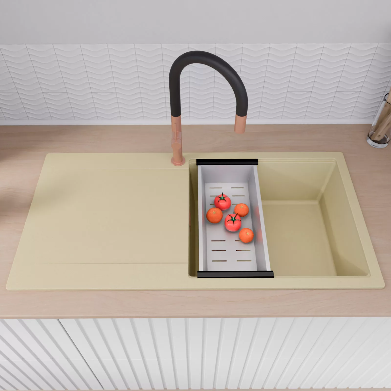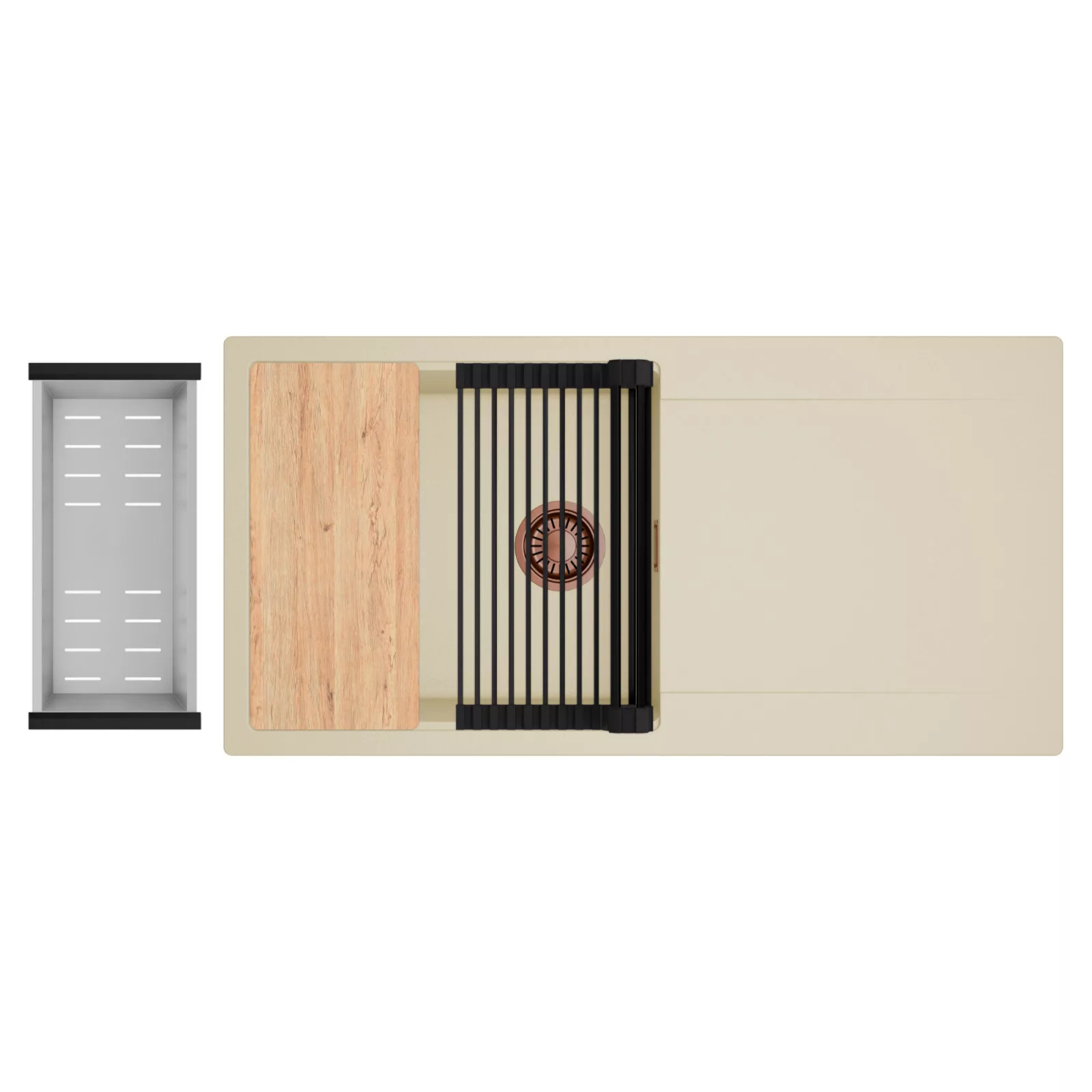 HD Onyx Beige 100 egymedencés mosogatótálca szett, vágódeszkával, csepegtetőráccsal és kosárral, soft bézs