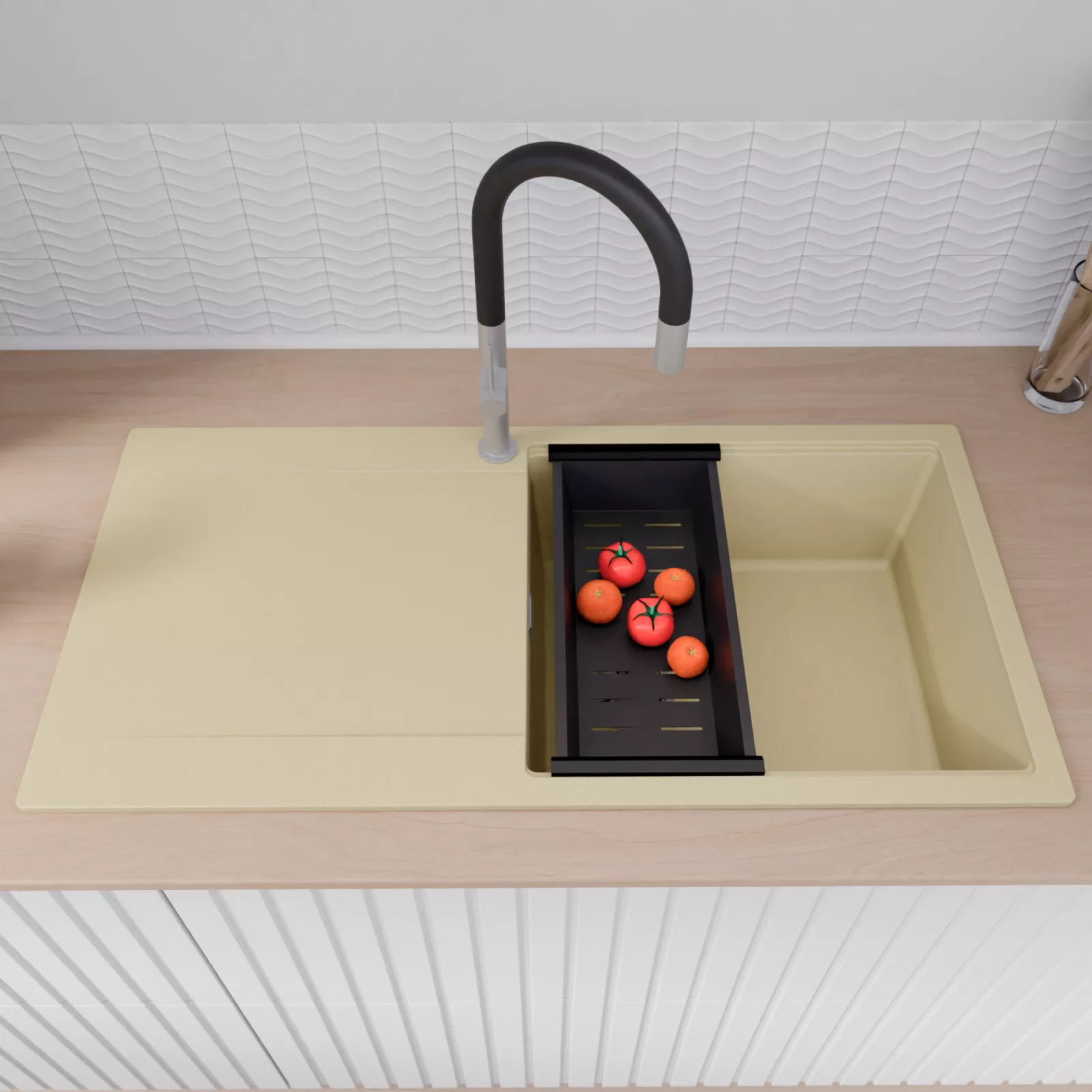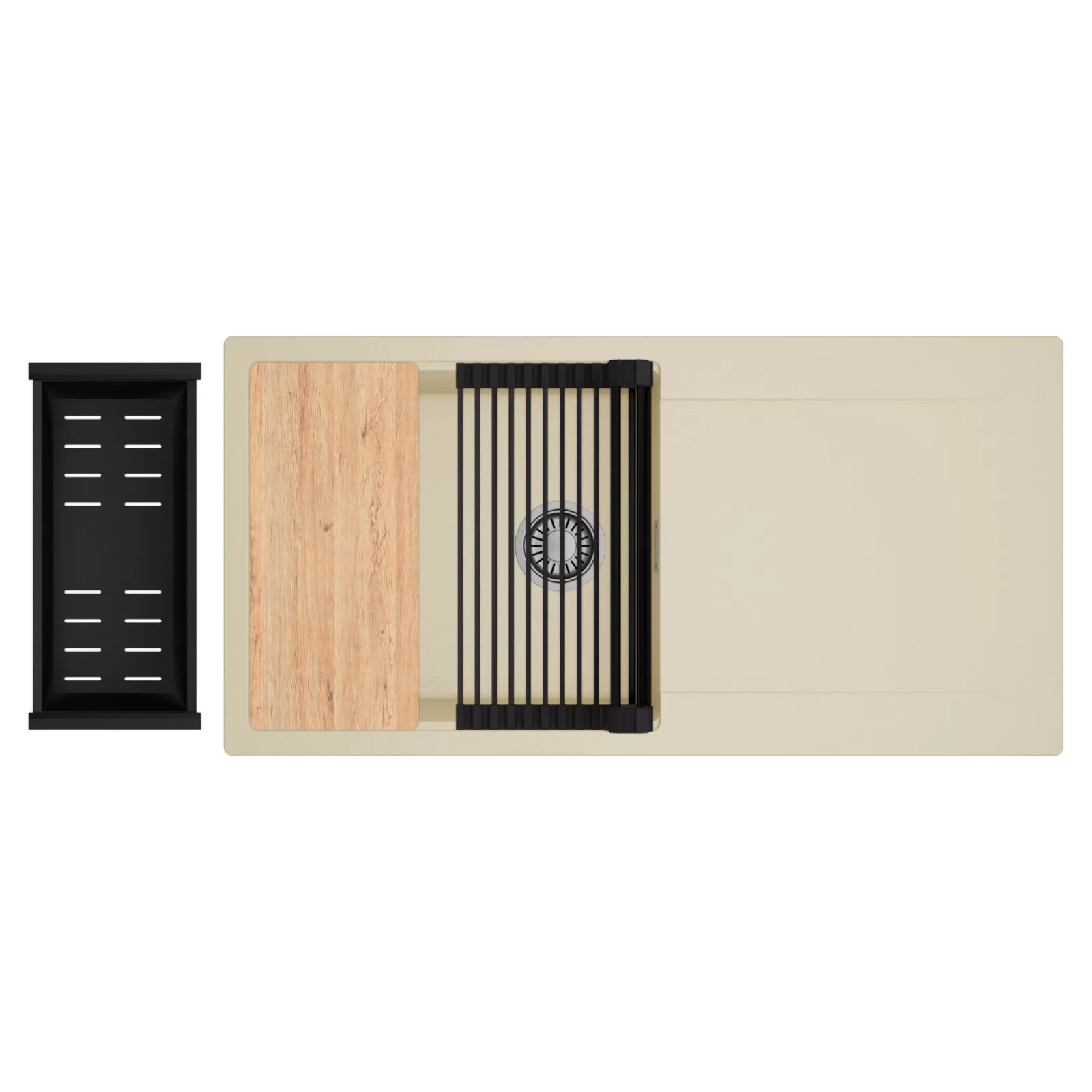 HD Onyx Beige 100 egymedencés mosogatótálca szett, vágódeszkával, csepegtetőráccsal és kosárral, soft bézs