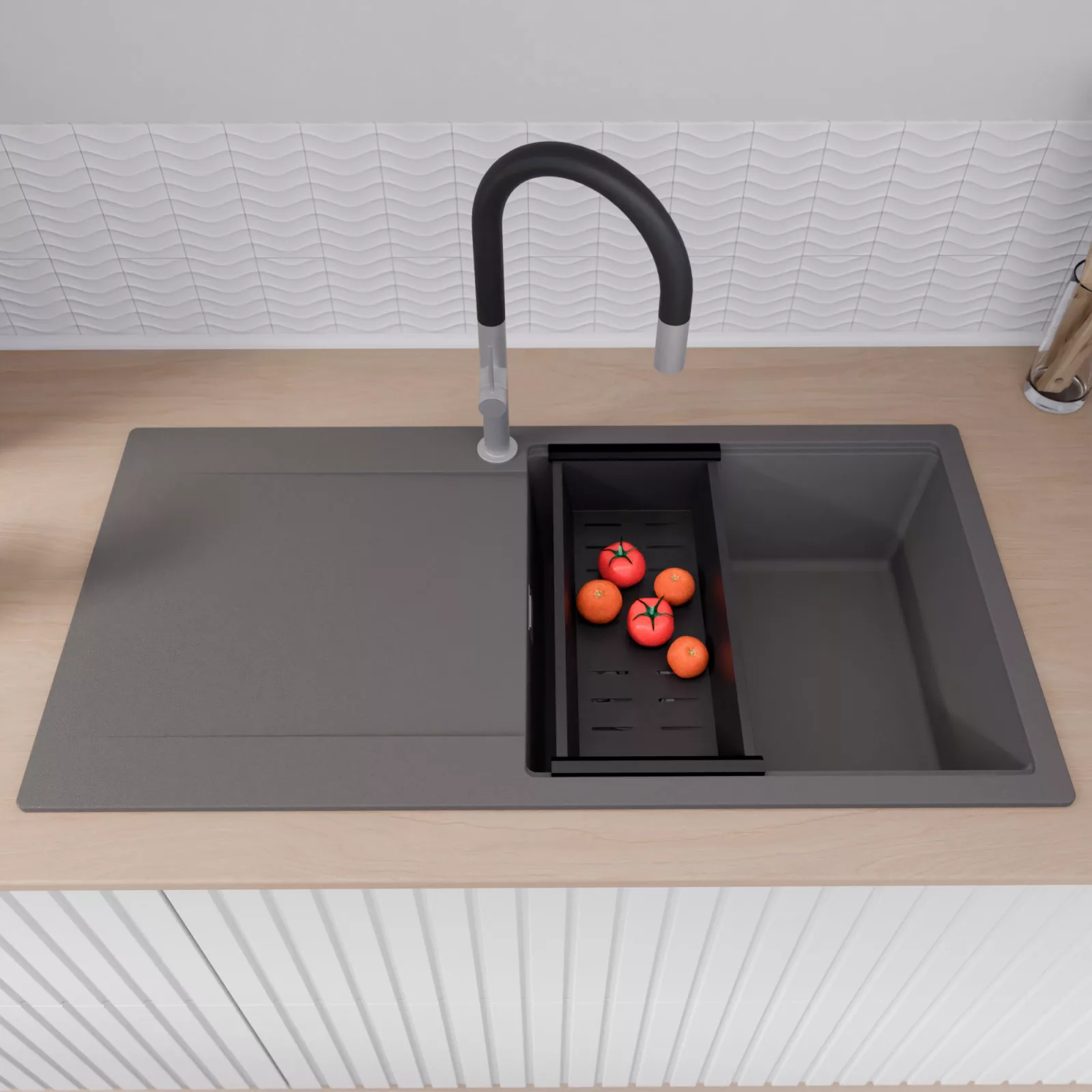 A mosogató prémium minőségű gránit kompozitból készült. Letisztult megjelenése mellett rendkívül praktikus, így bármilyen stílusú konyhába harmonikusan illeszkedik. A strapabíró gránit anyag hosszú távon is megbízható használatot garantál.