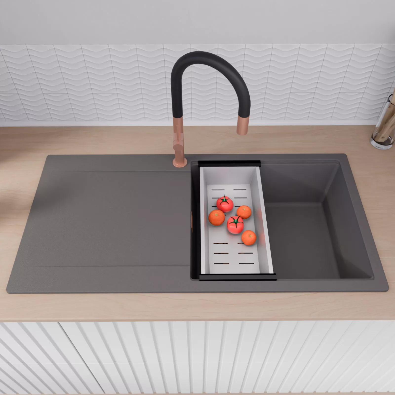 A mosogató prémium minőségű gránit kompozitból készült. Letisztult megjelenése mellett rendkívül praktikus, így bármilyen stílusú konyhába harmonikusan illeszkedik. A strapabíró gránit anyag hosszú távon is megbízható használatot garantál.