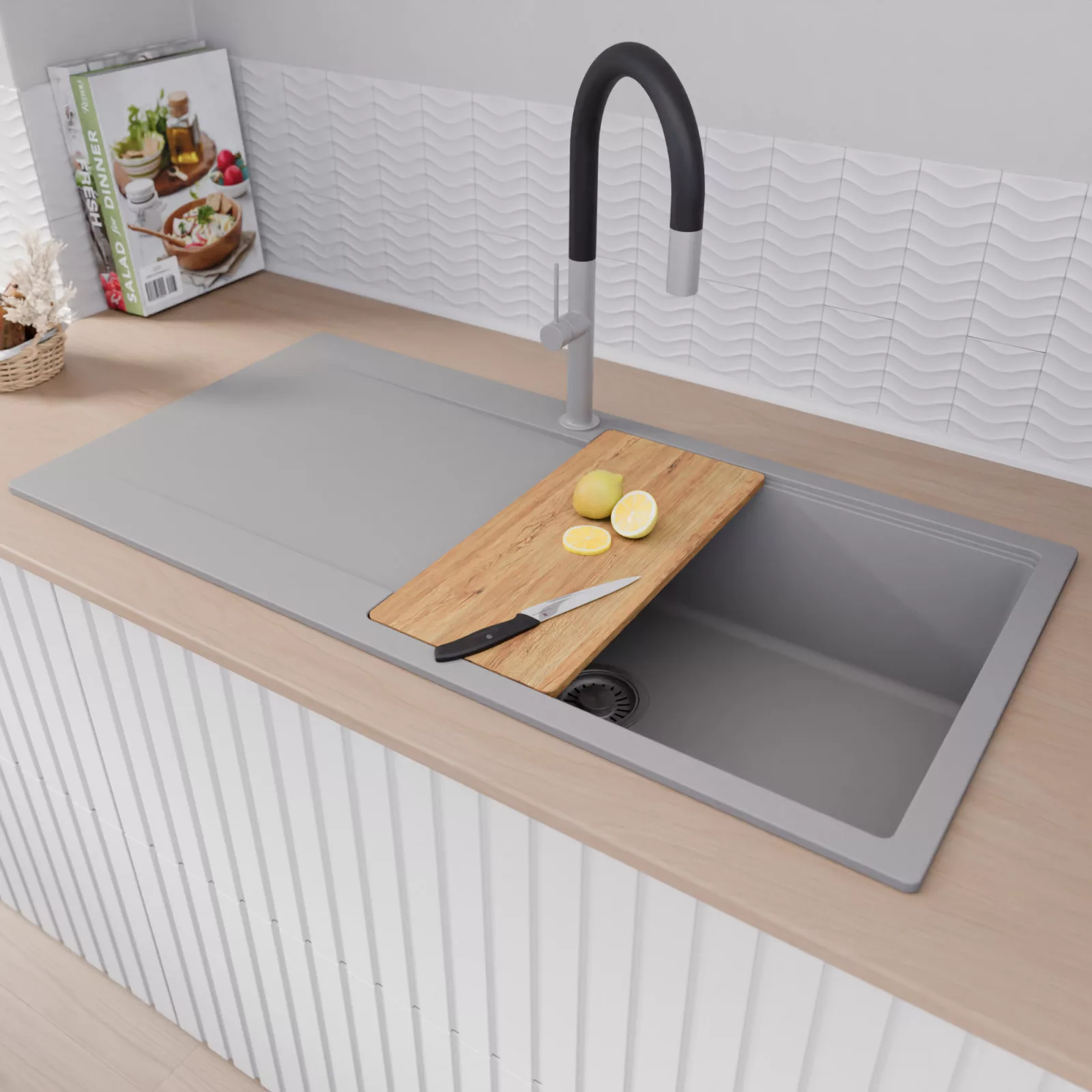 A mosogató prémium minőségű gránit kompozitból készült. Letisztult megjelenése mellett rendkívül praktikus, így bármilyen stílusú konyhába harmonikusan illeszkedik. A strapabíró gránit anyag hosszú távon is megbízható használatot garantál.