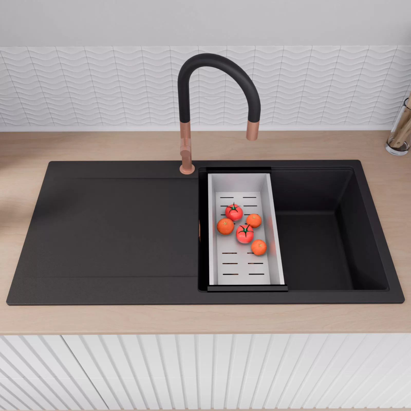 A mosogató prémium minőségű gránit kompozitból készült. Letisztult megjelenése mellett rendkívül praktikus, így bármilyen stílusú konyhába harmonikusan illeszkedik. A strapabíró gránit anyag hosszú távon is megbízható használatot garantál.