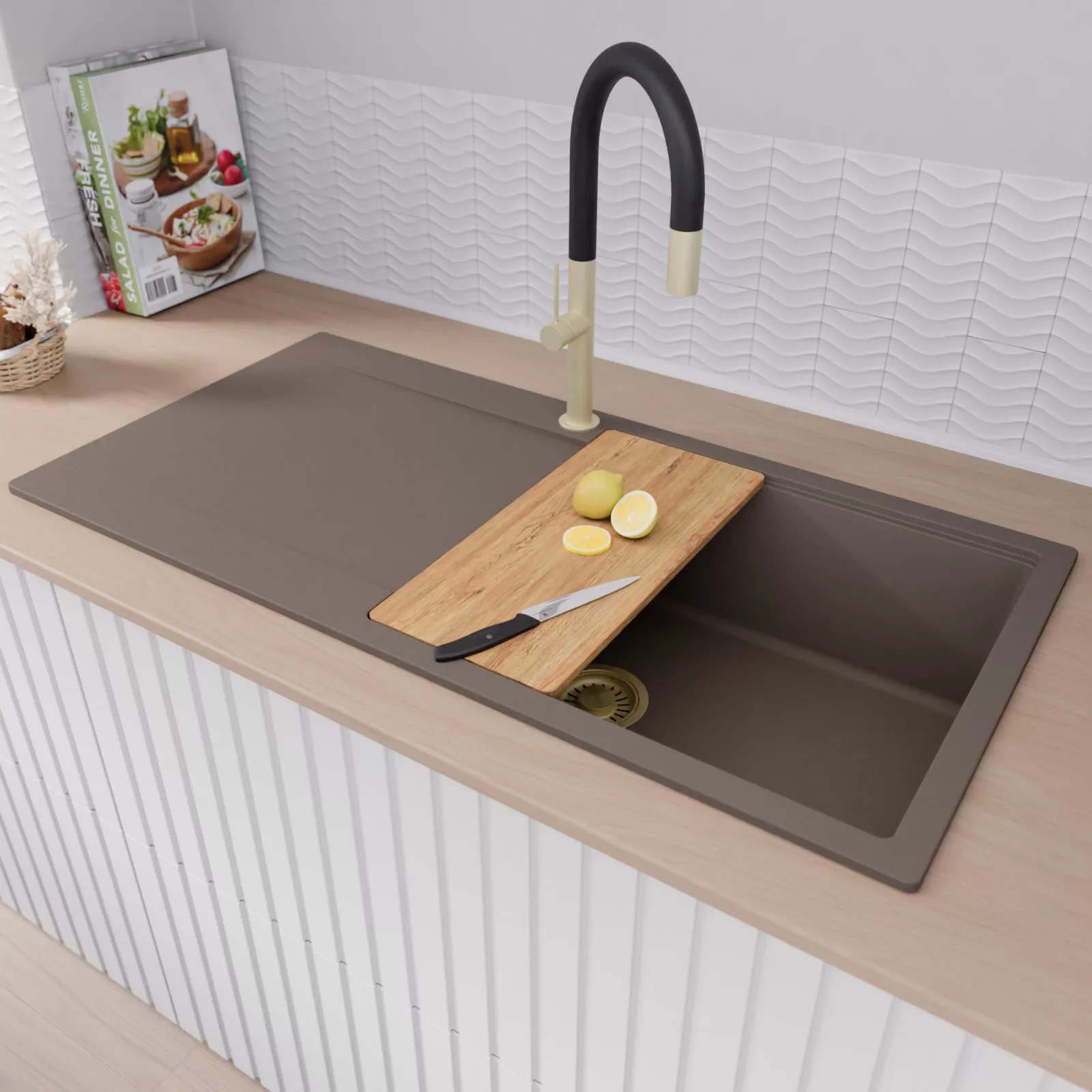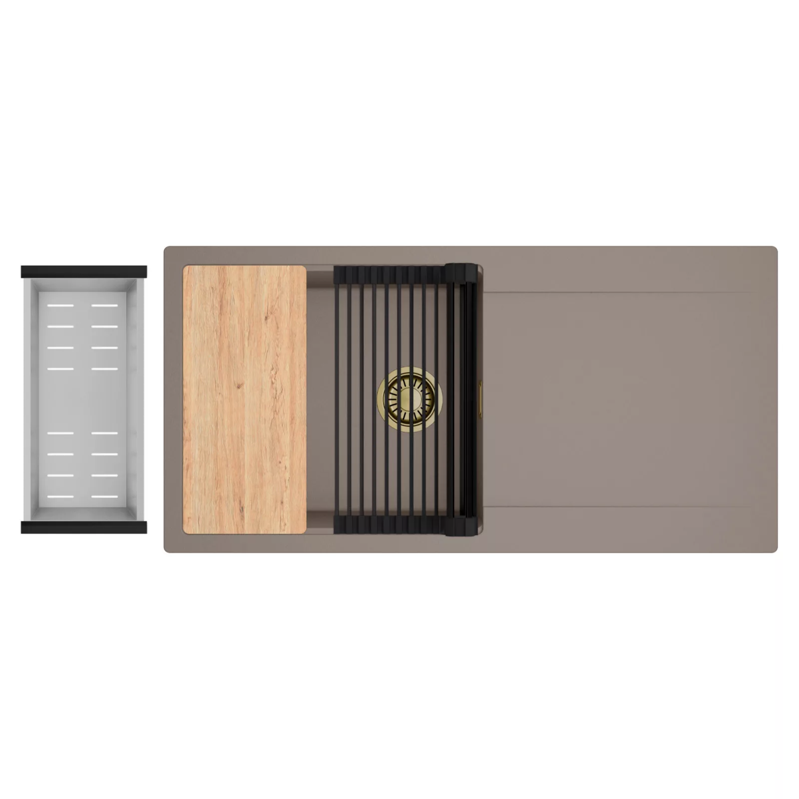 HD Onyx Tortora 100 egymedencés mosogatótálca szett, vágódeszkával, csepegtetőráccsal és kosárral, tortora