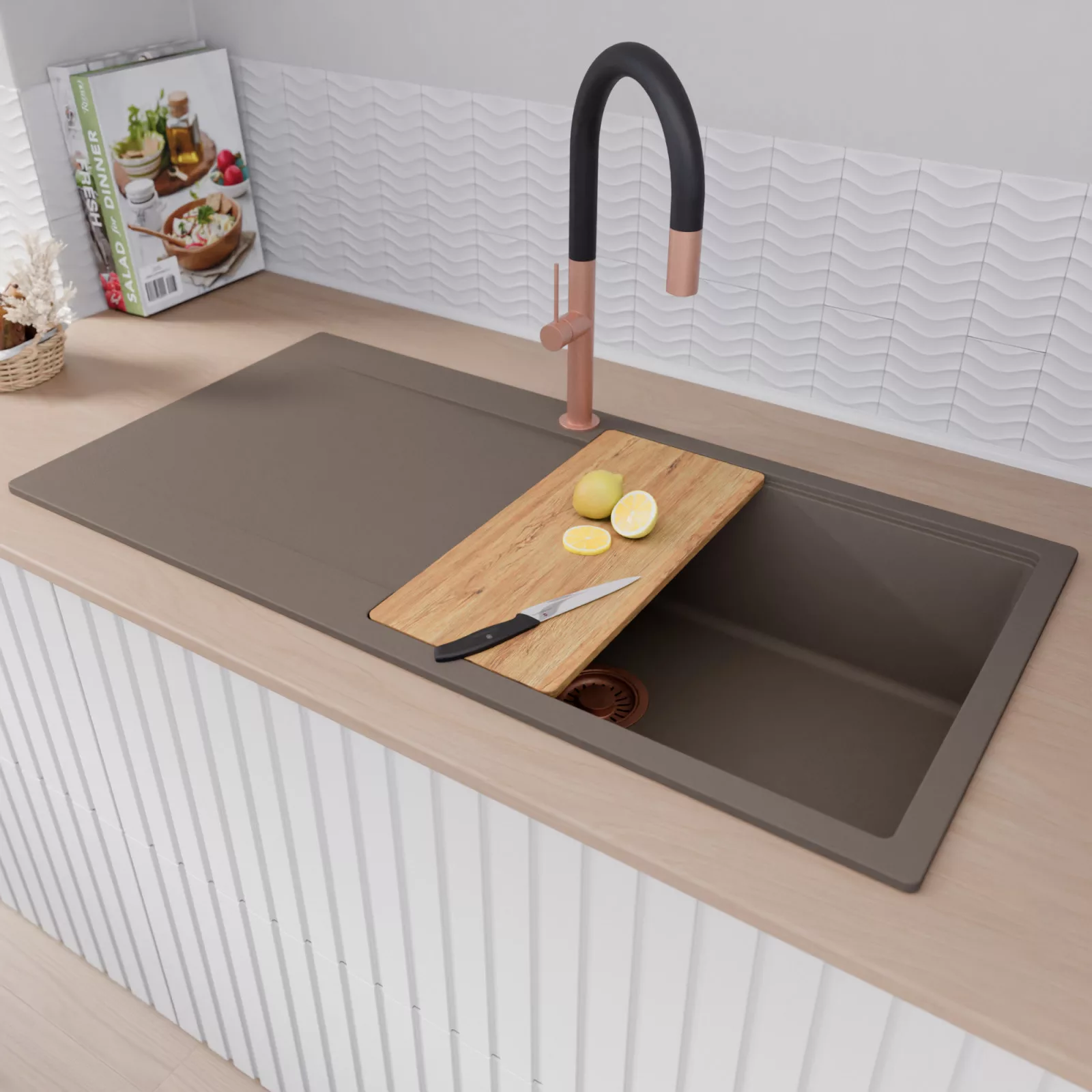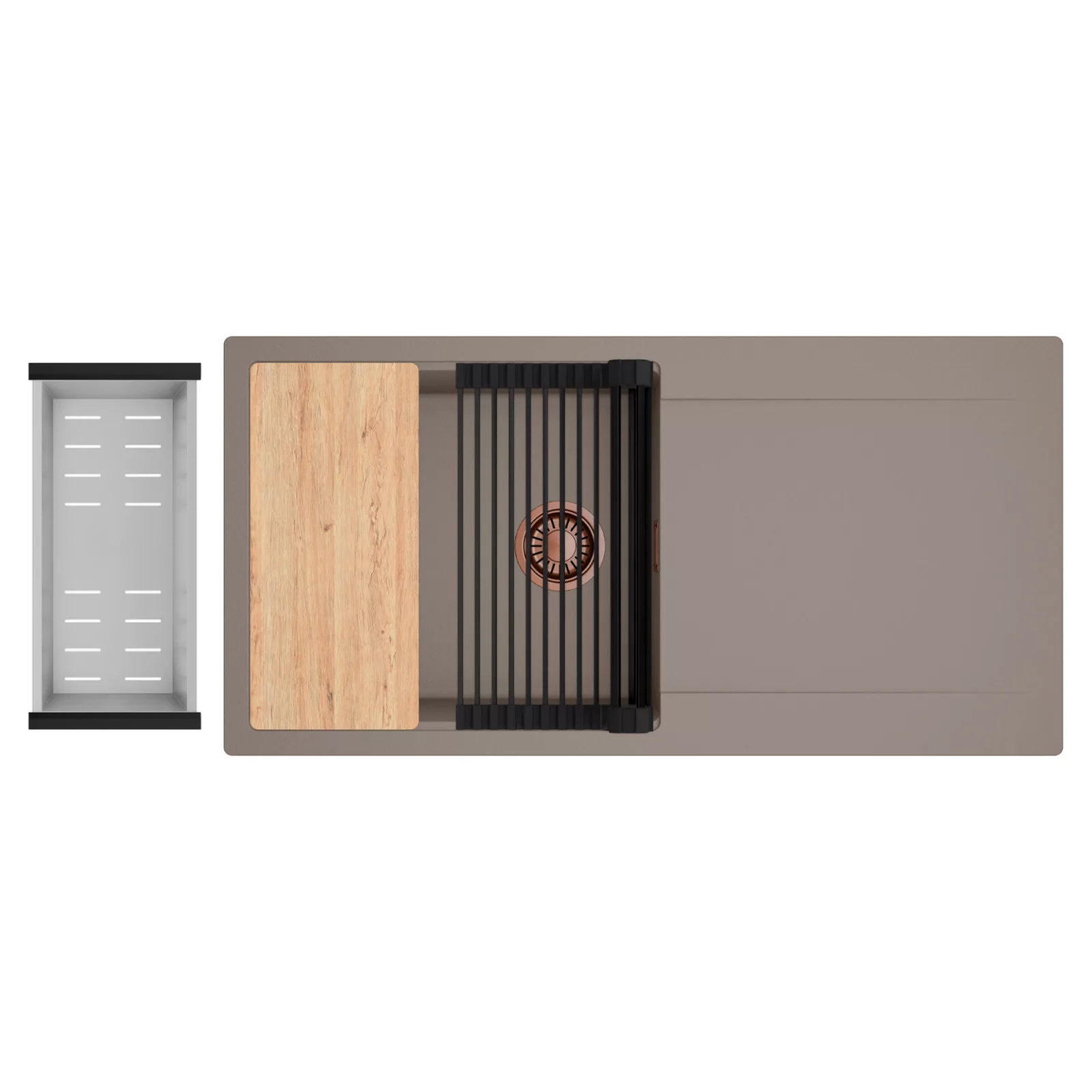 HD Onyx Tortora 100 egymedencés mosogatótálca szett, vágódeszkával, csepegtetőráccsal és kosárral, tortora