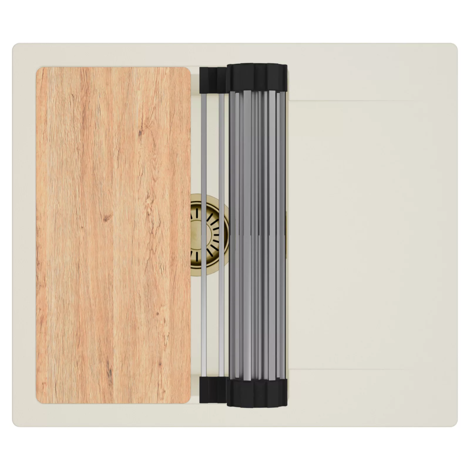HD Onyx White 58 egymedencés mosogatótálca szett, vágódeszkával, acél csepegtetőráccsal, csepegtetőtálcával, tört fehér színben, szálcsiszolt arany leeresztő szifonnal