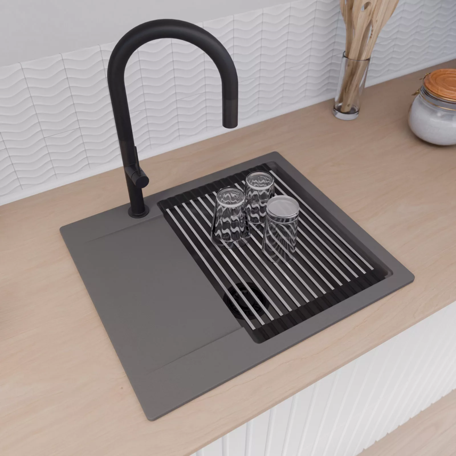 A mosogató prémium minőségű gránit kompozitból készült. Letisztult megjelenése mellett rendkívül praktikus, így bármilyen stílusú konyhába harmonikusan illeszkedik. A strapabíró gránit anyag hosszú távon is megbízható használatot garantál.