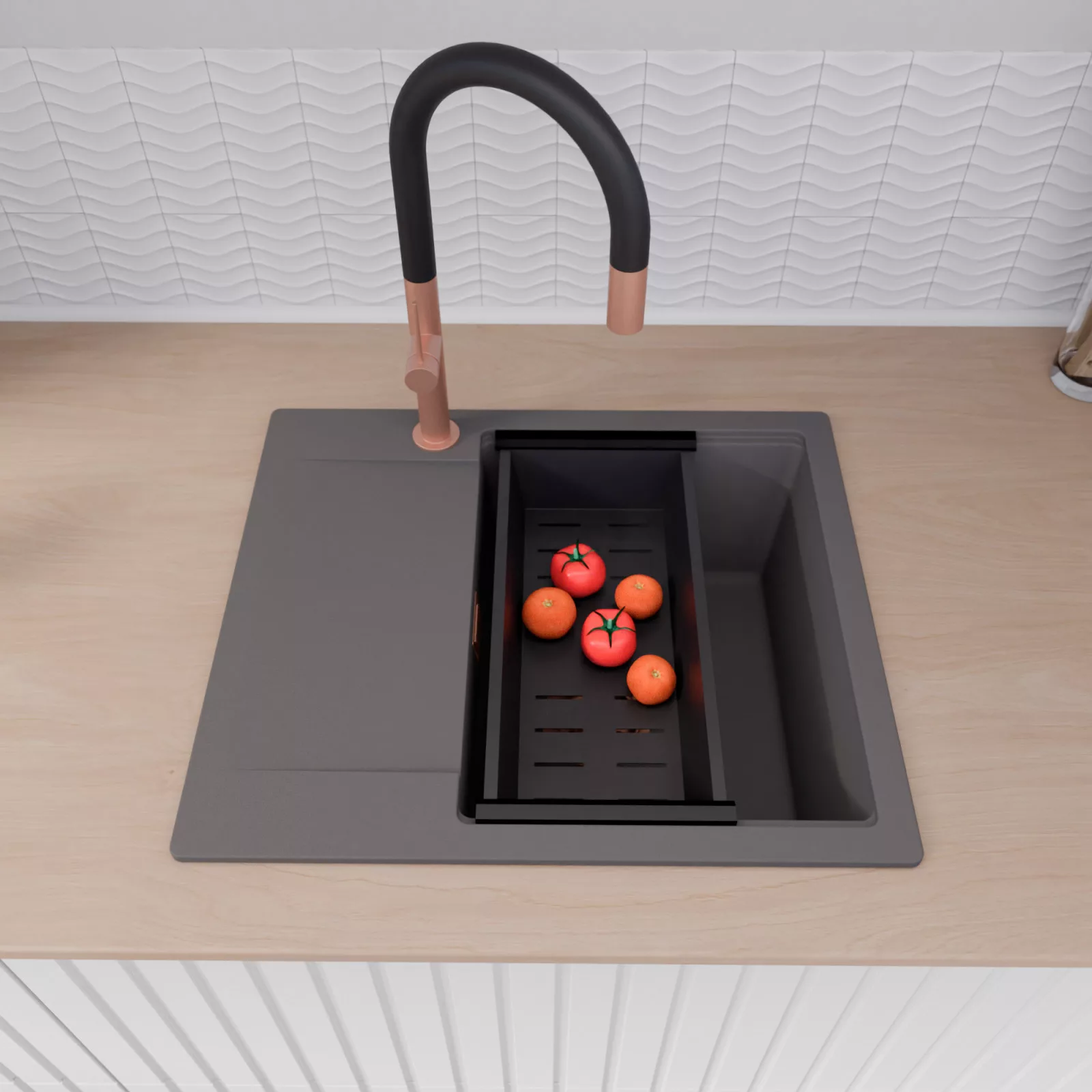 A mosogató prémium minőségű gránit kompozitból készült. Letisztult megjelenése mellett rendkívül praktikus, így bármilyen stílusú konyhába harmonikusan illeszkedik. A strapabíró gránit anyag hosszú távon is megbízható használatot garantál.
