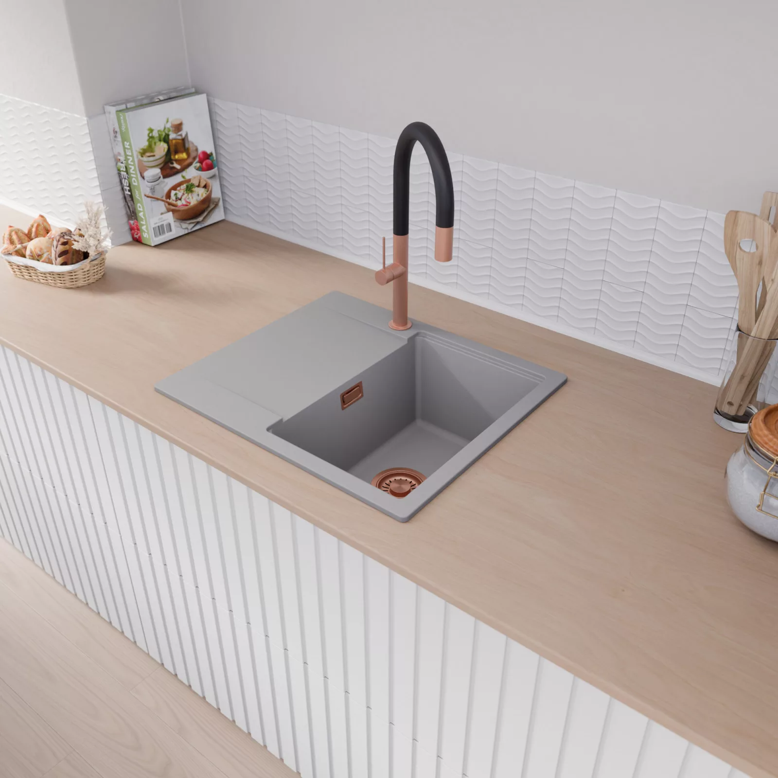 A mosogató prémium minőségű gránit kompozitból készült. Letisztult megjelenése mellett rendkívül praktikus, így bármilyen stílusú konyhába harmonikusan illeszkedik. A strapabíró gránit anyag hosszú távon is megbízható használatot garantál.