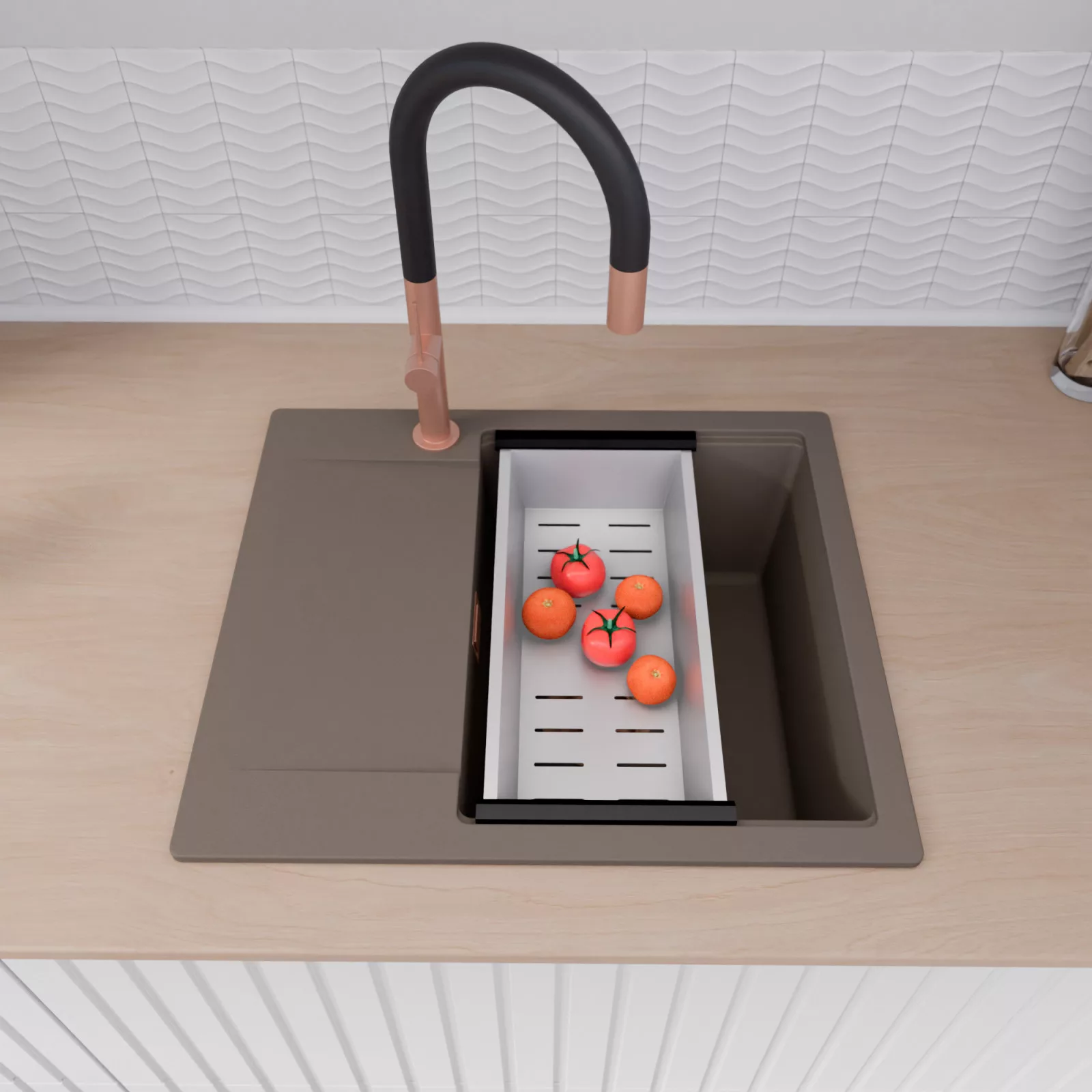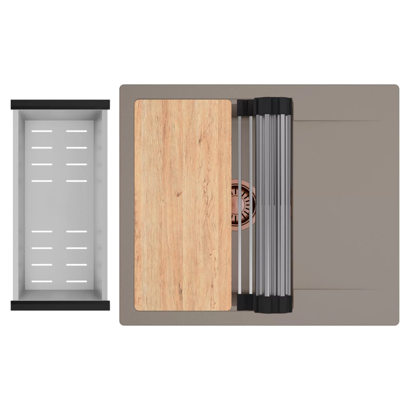 HD Onyx Tortora 58 egymedencés mosogatótálca szett, vágódeszkával, csepegtetőráccsal és kosárral, tortora