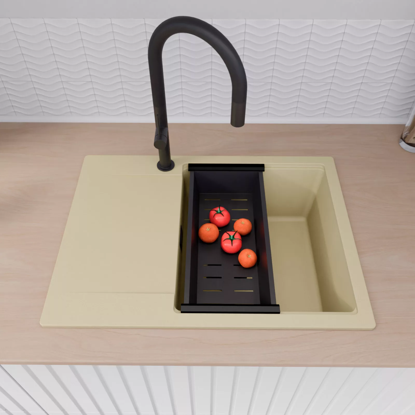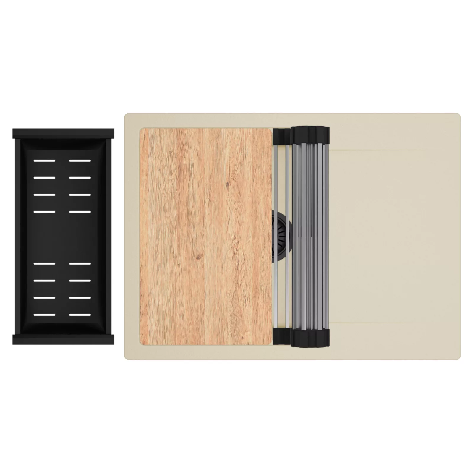 HD Onyx Beige 68-XL egymedencés mosogatótálca szett, vágódeszkával, csepegtetőráccsal és kosárral, soft bézs